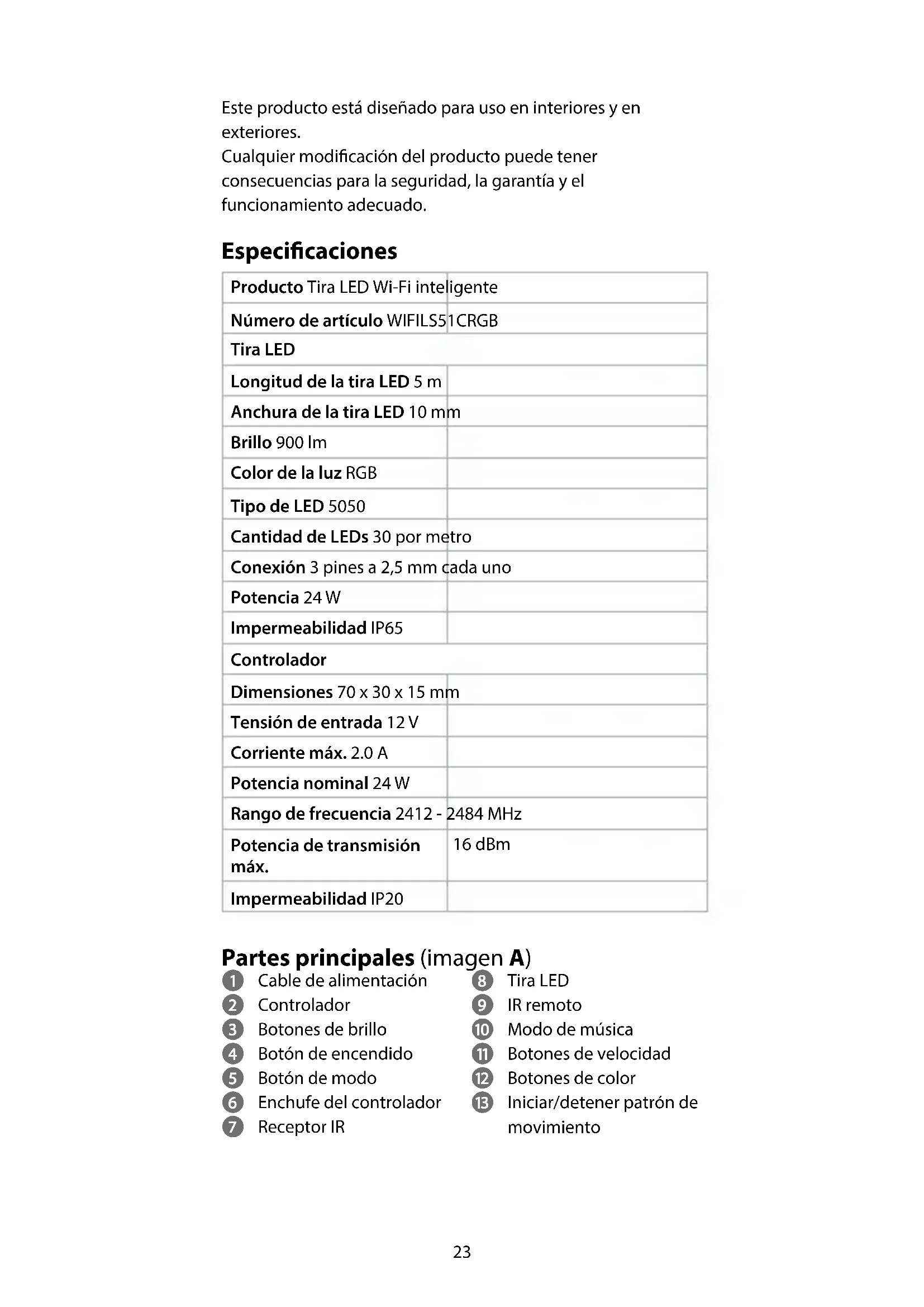Guía de inicio rápido Tira LED Wi-Fi inteligente WIFILS51CRGBPara más información, consulte el manual ampliado en línea: ned.is/wils51crgb Uso previsto por el fabricante Este producto es una tira LED Wi-Fi inteligente con un mando a distancia inalámbrico.El producto no está diseñado para un uso profesional.23 Este producto está diseñado para uso en interiores y en exteriores. Cualquier modicación del producto puede tener consecuencias para la seguridad, la garantía y el funcionamiento adecuado. Especicaciones Producto Tira LED Wi-Fi inteligente Número de artículo WIFILS51CRGB Tira LED Longitud de la tira LED 5 m Anchura de la tira LED 10 mm Brillo 900 lm Color de la luz RGB Tipo de LED 5050 Cantidad de LEDs 30 por metro Conexión 3 pines a 2,5 mm cada uno Potencia 24 W Impermeabilidad IP65 Controlador Dimensiones 70 x 30 x 15 mm Tensión de entrada 12 V Corriente máx. 2.0 A Potencia nominal 24 W Rango de frecuencia 2412 - 2484 MHz Potencia de transmisión máx. 16 dBm Impermeabilidad IP20 Partes principales (imagen A) 1 Cable de alimentación 2 Controlador 3 Botones de brillo 4 Botón de encendido 5 Botón de modo 6 Enchufe del controlador 7 Receptor IR 8 Tira LED 9 IR remoto q Modo de música w Botones de velocidad e Botones de color r Iniciar/detener patrón de movimiento24 Instrucciones de seguridad