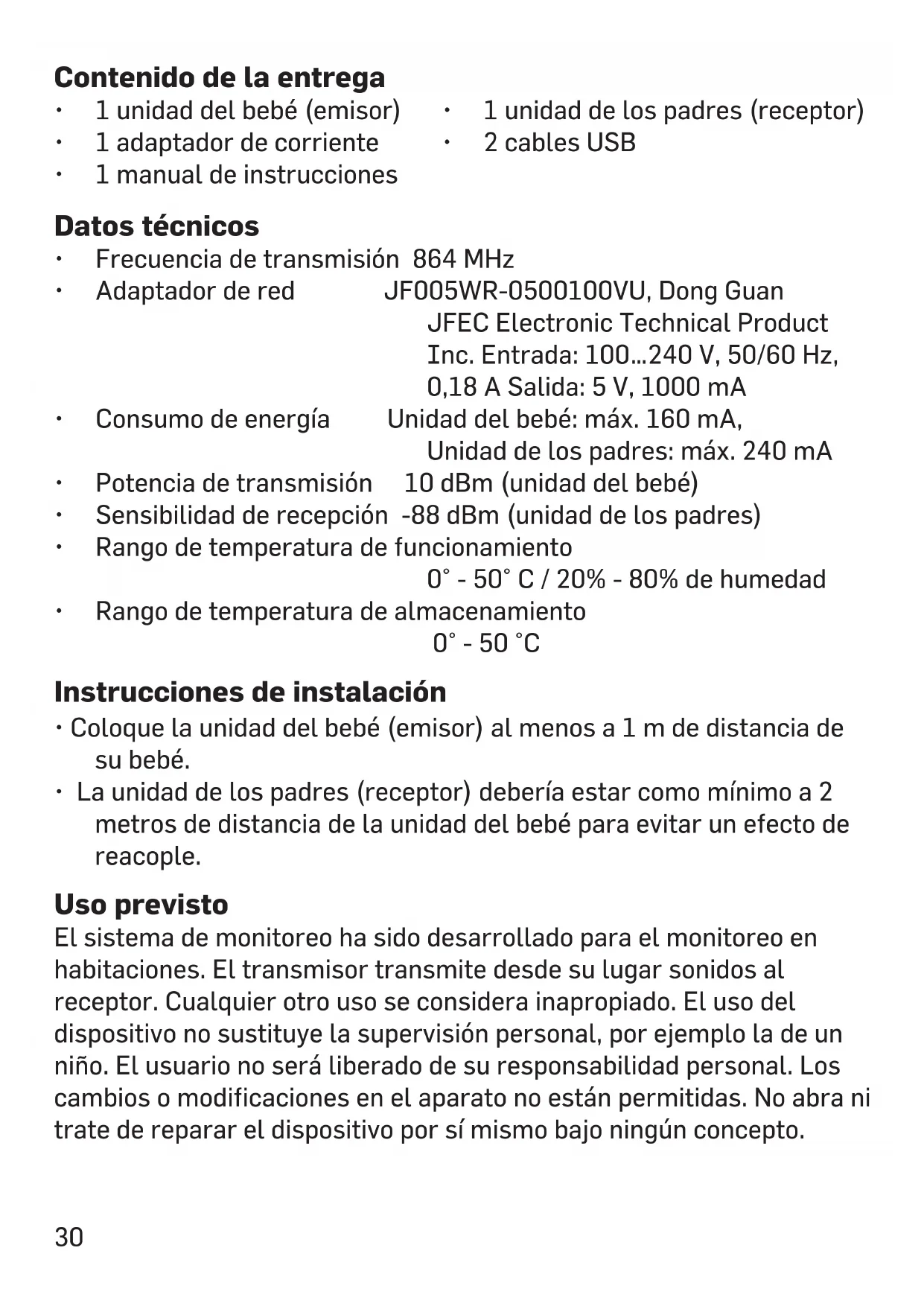 - La unidad de los padres (receptor) debería estar como mínimo a 2 metros de distancia de la unidad del bebé para evitar un efecto de reacople. Uso previsto El sistema de monitoreo ha sido desarrollado para el monitoreo en habitaciones. El transmisor transmite desde su lugar sonidos al receptor. Cualquier otro uso se considera inapropiado. El uso del dispositivo no sustituye la supervisión personal, por ejemplo la de un niño. El usuario no será liberado de su responsabilidad personal. Los cambios o modificaciones en el aparato no están permitidas. No abra ni trate de reparar el dispositivo por sí mismo bajo ningún concepto. 30Instrucciones de mantenimiento