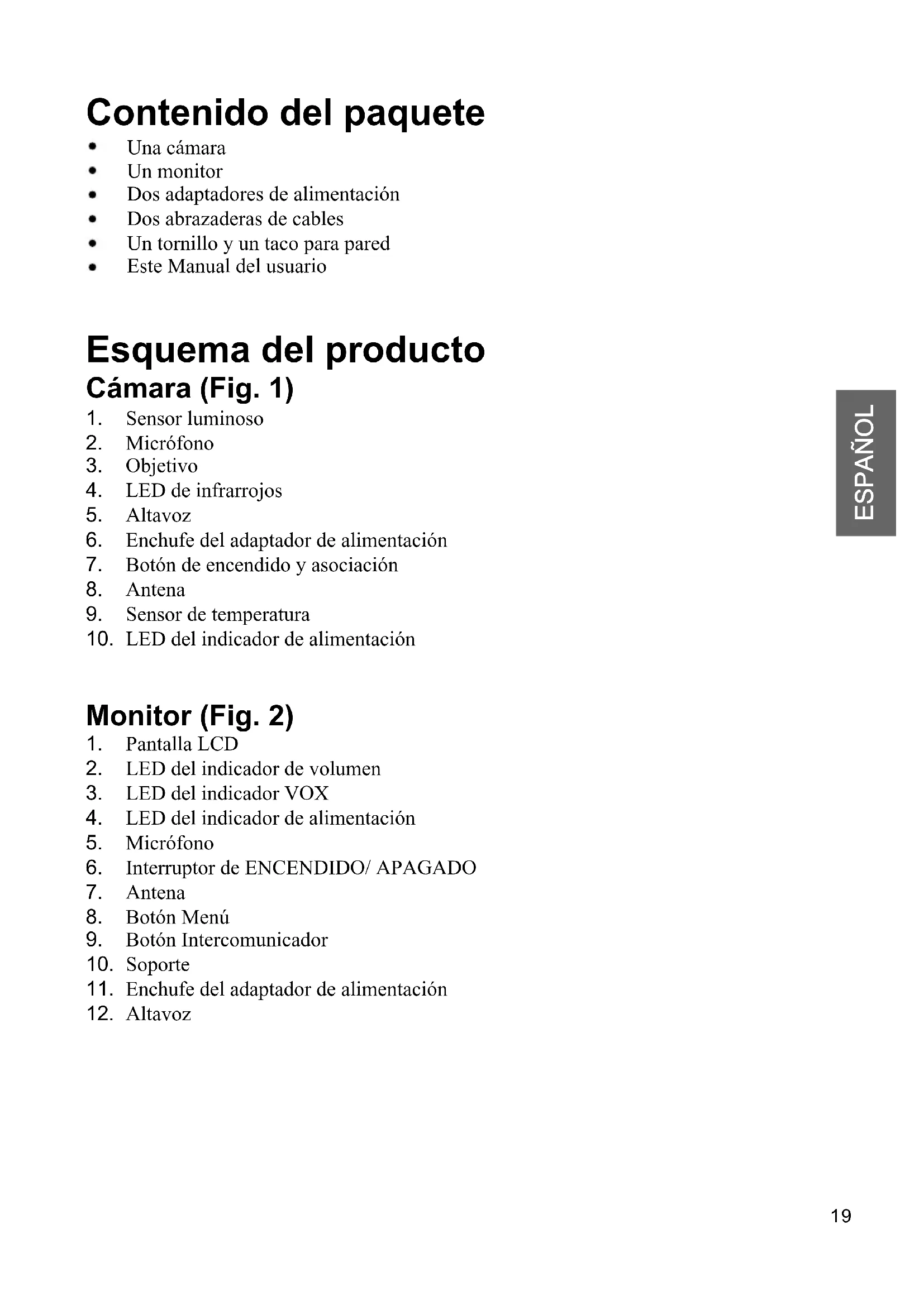 ESPAÑOL Contenido del paquete Una cámara Un monitor Dos adaptadores de alimentación Dos abrazaderas de cables Un tornillo y un taco para pared Este Manual del usuario Esquema del producto Cámara (Fig. 1)