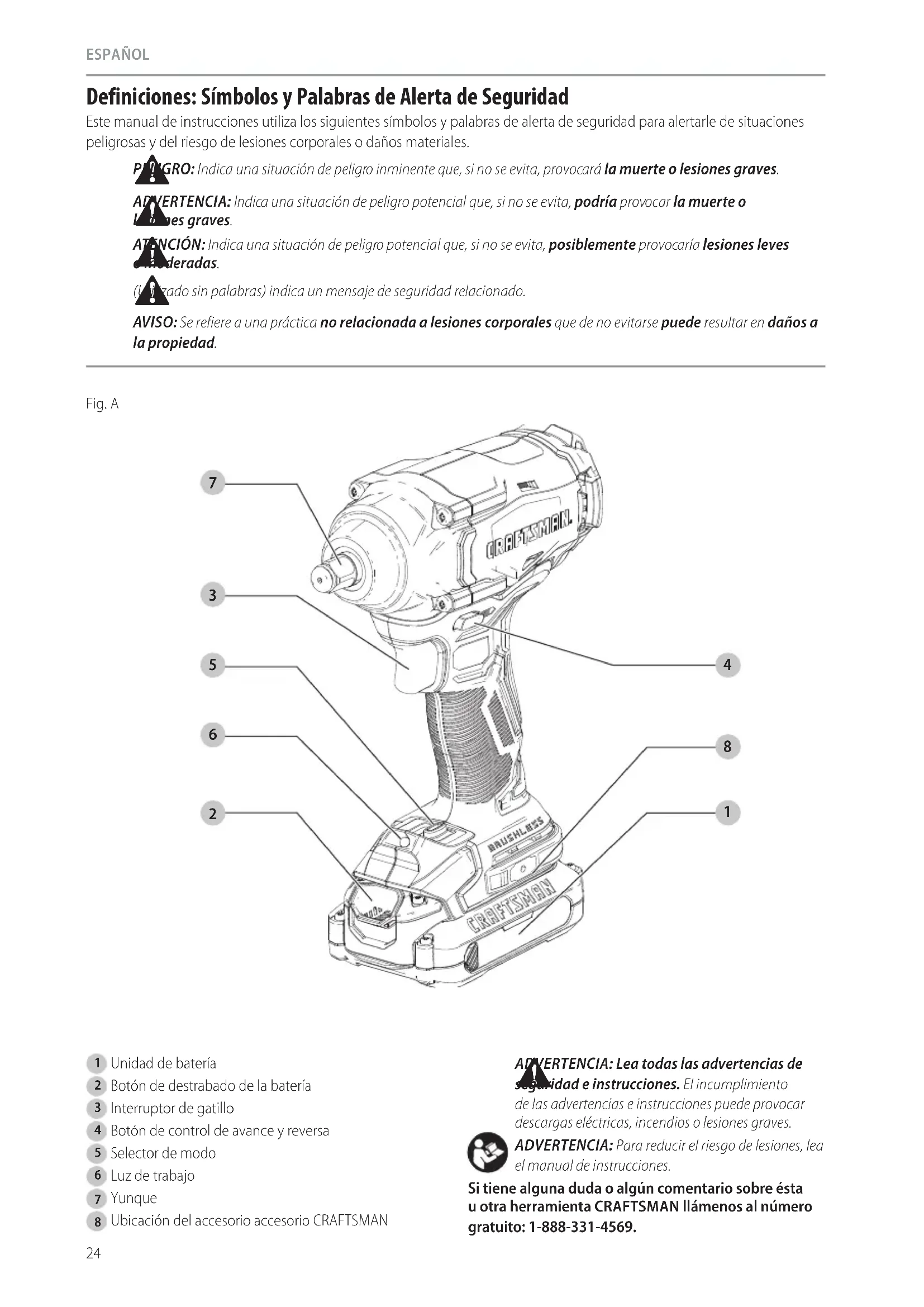 ADVERTENCIA: Lea todas las advertencias de seguridad e instrucciones. El incumplimiento de las advertencias e instrucciones puede provocar descargas eléctricas, incendios o lesionesgraves. ADVERTENCIA: Para reducir el riesgo de lesiones, lea el manual deinstrucciones. Si tiene alguna duda o algún comentario sobre ésta u otra herramienta CRAFTSMAN llámenos al número gratuito: 1-888-331-4569.