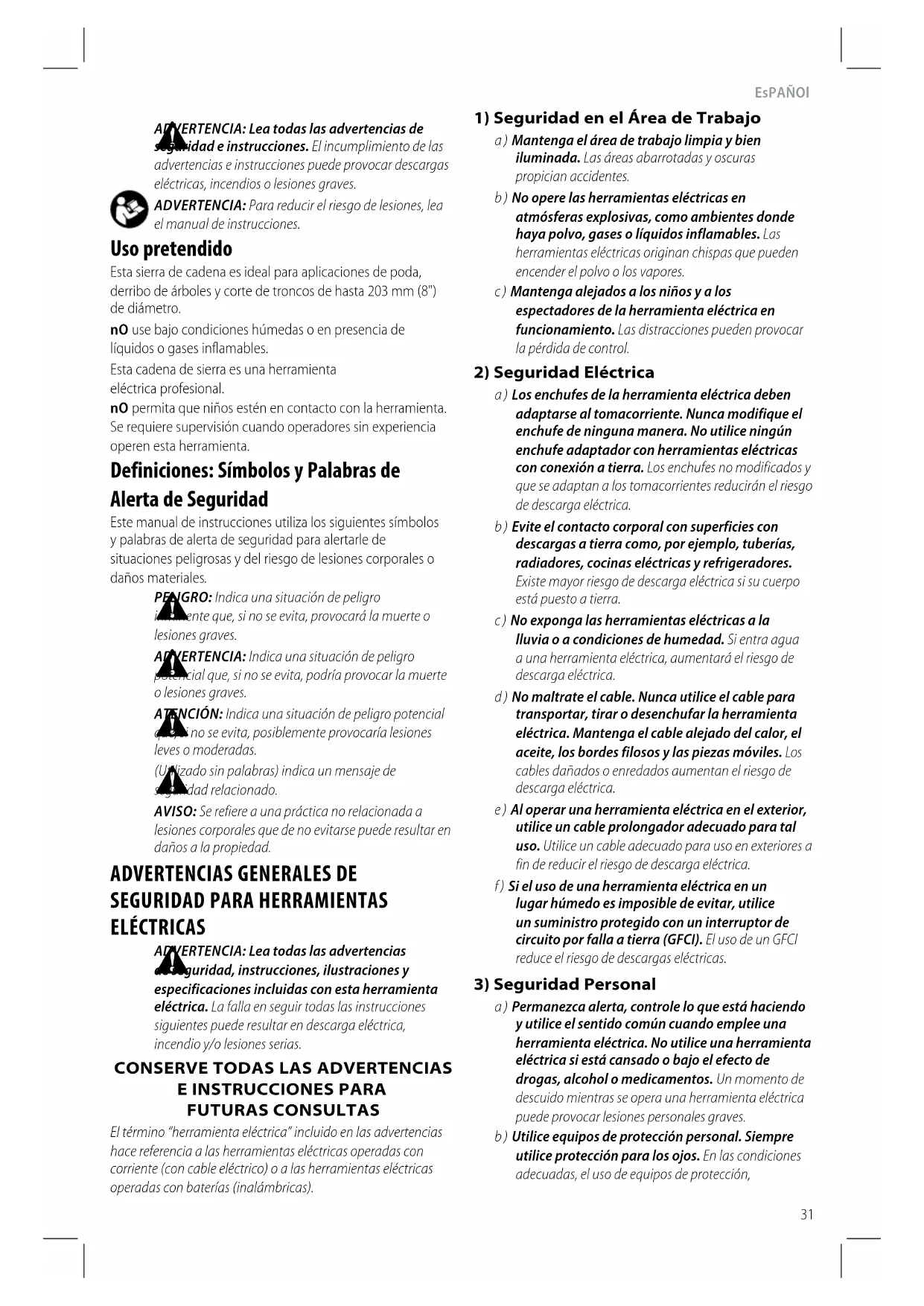 (Utilizado sin palabras) indica un mensaje de seguridadrelacionado. AVISO: Se refiere a una práctica no relacionada a lesiones corporales que de no evitarse puede resultar en daños a lapropiedad. Uso pretendido Esta sierra de cadena es ideal para aplicaciones de poda, derribo de árboles y corte de troncos de hasta 203 mm (8") dediámetro. nO use bajo condiciones húmedas o en presencia de líquidos o gasesinflamables. Esta cadena de sierra es una herramienta eléctricaprofesional. nO permita que niños estén en contacto con la herramienta. Se requiere supervisión cuando operadores sin experiencia operen estaherramienta.