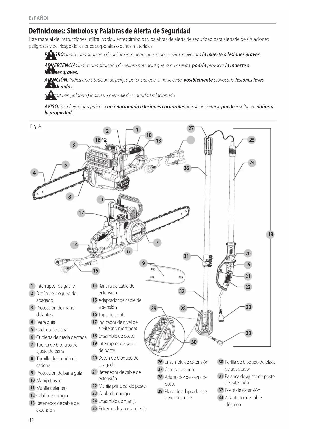 ADVERTENCIA: Para reducir el riesgo de lesiones personales, apague la unidad y desconéctela de la fuente de energía antes de realizar cualquier ajuste o retirar/instalar conexiones o accesorios. Un arranque accidental puede causarlesiones. Desconexión de sierra de cadena y ensamble de poste de extensión (Fig.X–AA)