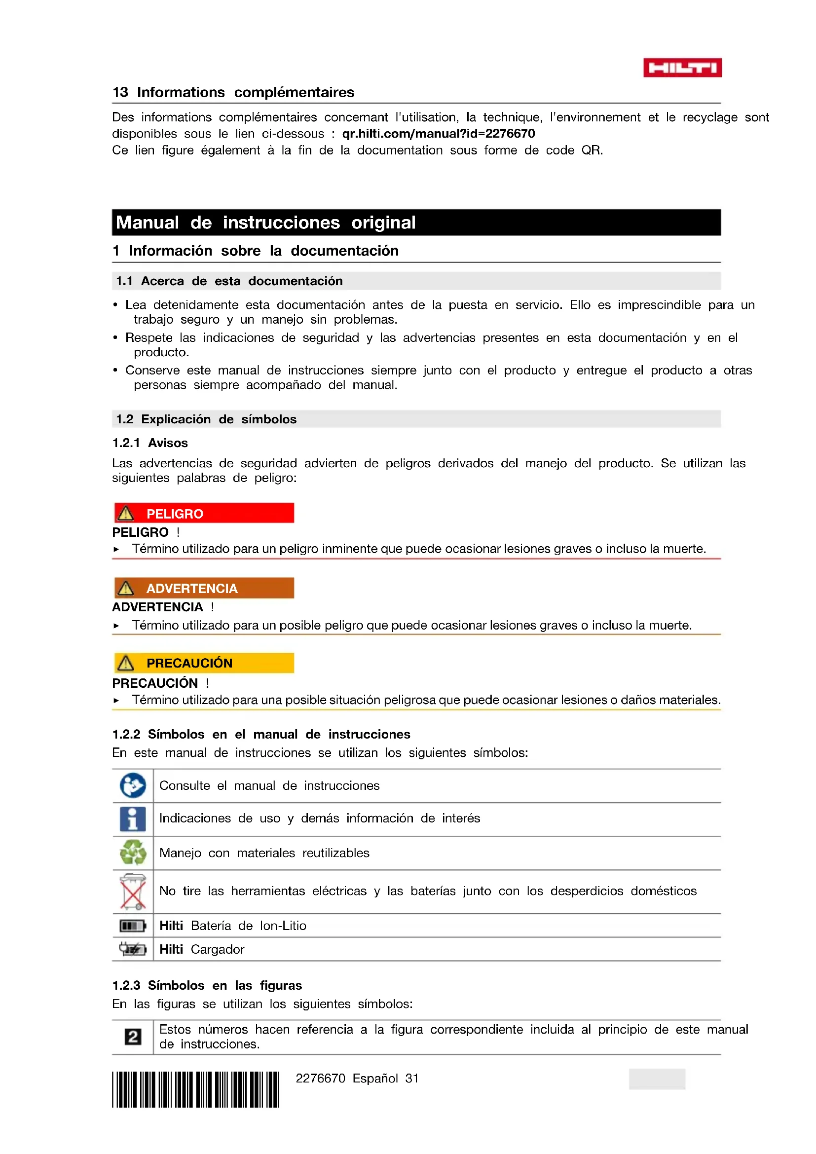 deseadas. 13 Más información Encontrará información adicional sobre manejo, técnica, medio ambiente y reciclaje en el siguiente enlace: qr.hilti.com/manual?id=2276670 Encontrará este enlace también al final de la documentación como código QR. Manual de instruções original 1 Indicações sobre a documentação