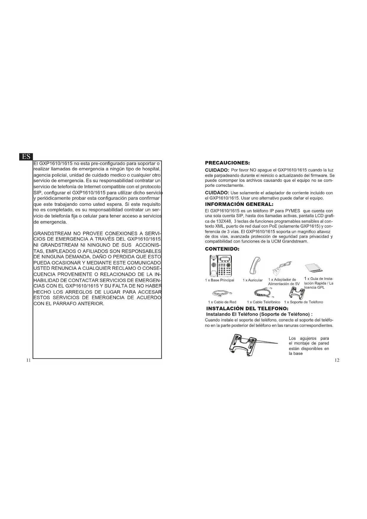 CON EL PÁRRAFO ANTERIOR. PRECAUCIONES: CUIDADO: Por favor NO apague el GXP1610/1615 cuando la luz este parpadeando durante el reinicio o actualizando del firmware. Se puede corromper los archivos causando que el equipo no se com- porte correctamente. CUIDADO: Use solamente el adaptador de corriente incluido con el GXP1610/1615. Usar uno alternativo puede dañar el equipo. INFORMACIÓN GENERAL: El GXP1610/1615 es un teléfono IP para PYMES que cuenta con una sola cuenta SIP, hasta dos llamadas activas, pantalla LCD grafi- ca de 132X48, 3 teclas de funciones programables sensibles al con- texto XML, puerto de red dual con PoE (solamente GXP1615) y con- ferencia de 3 vías. El GXP1610/1615 soporta un magnifico altavoz de dos vías, avanzada protección de seguridad para privacidad y compatibilidad con funciones de la UCM Grandstream. CONTENIDO: 1 x Cable Telefónico 1 x Cable de Red 1 x Soporte de Teléfono 1 x Guia de Insta- lación Rapida / La licencia GPL 1 x Base Principal 1 x Auricular 1 x Adaptador de Alimentación de 5V 5 V INSTALACIÓN DEL TELEFONO: Instalando El Teléfono (Soporte de Teléfono) : Cuando instale el soporte del teléfono, conecte el soporte del teléfo- no en la parte posterior del teléfono en las ranuras correspondientes. Los agujeros para el montaje de pared están disponibles en la base14