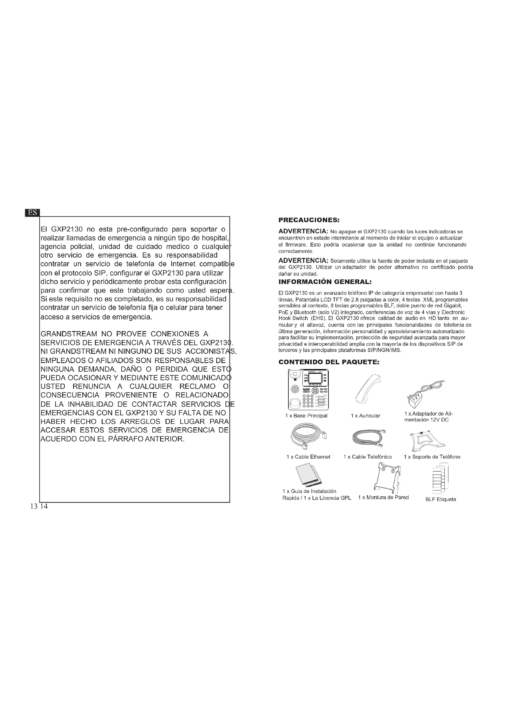 1 x Auricular 1 x Cable Telefónico 1 x Cable Ethernet El GXP2130 no esta pre-configurado para soportar o realizar llamadas de emergencia a ningún tipo de hospital, agencia policial, unidad de cuidado medico o cualquier otro servicio de emergencia. Es su responsabilidad contratar un servicio de telefonía de Internet compatible con el protocolo SIP, configurar el GXP2130 para utilizar dicho servicio y periódicamente probar esta configuración para confirmar que este trabajando como usted espera. Si este requisito no es completado, es su responsabilidad contratar un servicio de telefonía fija o celular para tener acceso a servicios de emergencia.