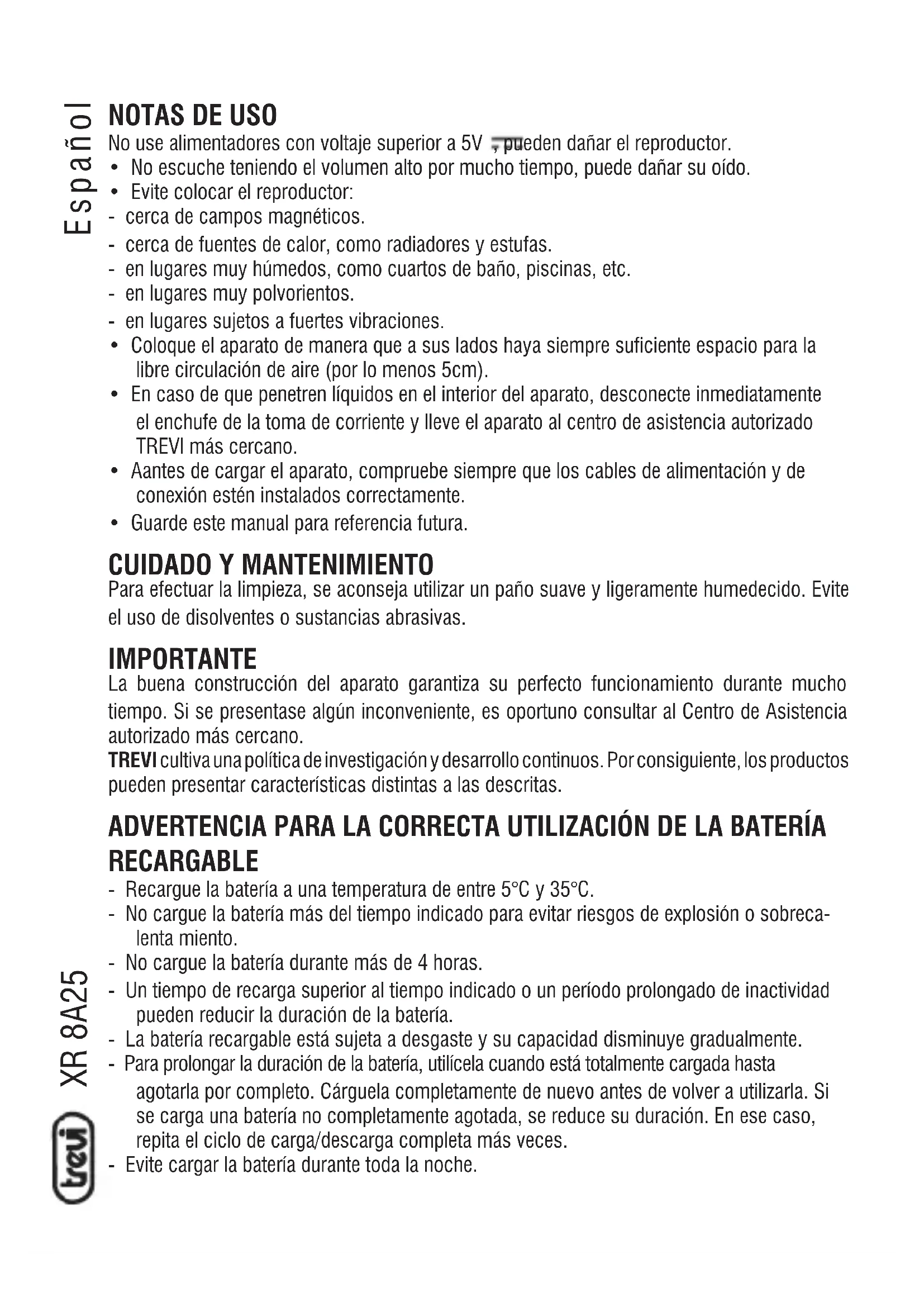 Para efectuar la limpieza, se aconseja utilizar un paño suave y ligeramente humedecido. Evite el uso de disolventes o sustancias abrasivas. IMPORTANTE La buena construcción del aparato garantiza su perfecto funcionamiento durante mucho tiempo. Si se presentase algún inconveniente, es oportuno consultar al Centro de Asistencia autorizado más cercano. TREVI cultiva una política de investigación y desarrollo continuos. Por consiguiente, los productos pueden presentar características distintas a las descritas. ADVERTENCIA PARA LA CORRECTA UTILIZACIÓN DE LA BATERÍA RECARGABLE - Recargue la batería a una temperatura de entre 5°C y 35°C. - No cargue la batería más del tiempo indicado para evitar riesgos de explosión o sobreca- lenta miento. - No cargue la batería durante más de 4 horas. - Un tiempo de recarga superior al tiempo indicado o un período prolongado de inactividad pueden reducir la duración de la batería. - La batería recargable está sujeta a desgaste y su capacidad disminuye gradualmente. - Para prolongar la duración de la batería, utilícela cuando está totalmente cargada hasta agotarla por completo. Cárguela completamente de nuevo antes de volver a utilizarla. Si se carga una batería no completamente agotada, se reduce su duración. En ese caso, repita el ciclo de carga/descarga completa más veces. - Evite cargar la batería durante toda la noche. EspañolXR 8A25 Español CARGA El altavoz se debe recargar cuando está apagado.