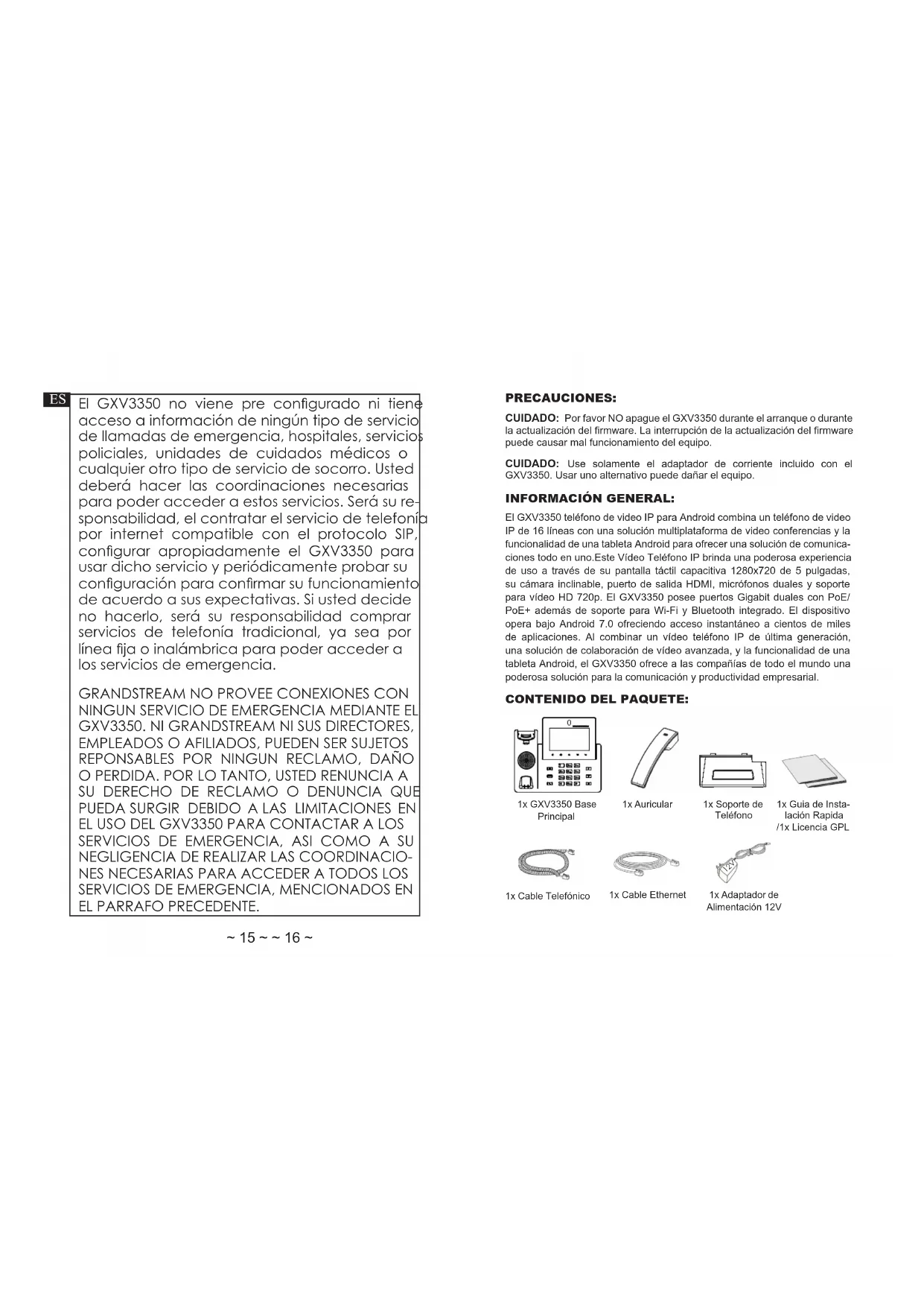 El GXV3350 no viene pre congurado ni tiene acceso a información de ningún tipo de servicio de llamadas de emergencia, hospitales, servicios policiales, unidades de cuidados médicos o cualquier otro tipo de servicio de socorro. Usted deberá hacer las coordinaciones necesarias para poder acceder a estos servicios. Será su re- sponsabilidad, el contratar el servicio de telefonía por internet compatible con el protocolo SIP, congurar apropiadamente el GXV3350 para usar dicho servicio y periódicamente probar su conguración para conrmar su funcionamiento de acuerdo a sus expectativas. Si usted decide no hacerlo, será su responsabilidad comprar servicios de telefonía tradicional, ya sea por línea ja o inalámbrica para poder acceder a los servicios de emergencia.