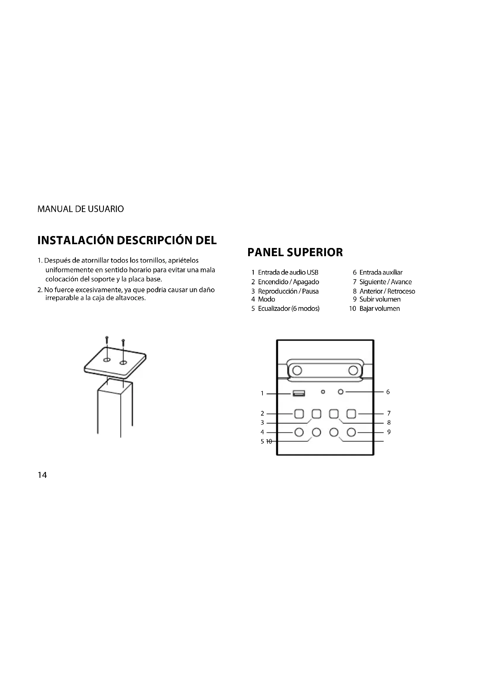Entrada de audio USB Encendido / Apagado Reproducción / Pausa Modo Ecualizador (6 modos) Entrada auxiliar Siguiente / Avance Anterior / Retroceso Subir volumen Bajar volumen