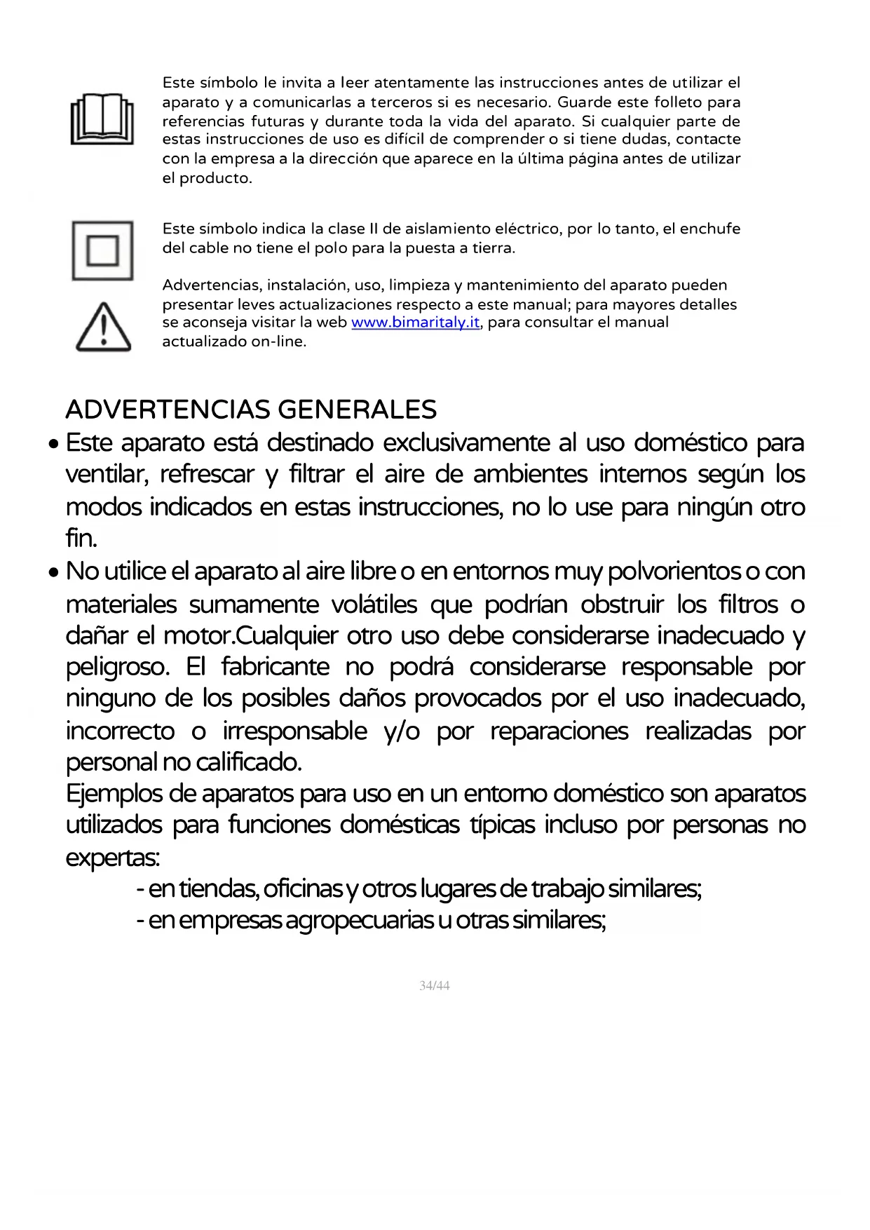 Este símbolo indica la clase II de aislamiento eléctrico, por lo tanto, el enchufe del cable no tiene el polo para la puesta a tierra. Advertencias, instalación, uso, limpieza y mantenimiento del aparato pueden presentar leves actualizaciones respecto a este manual; para mayores detalles se aconseja visitar la web www.bimaritaly.it , para consultar el manual actualizado on-line.