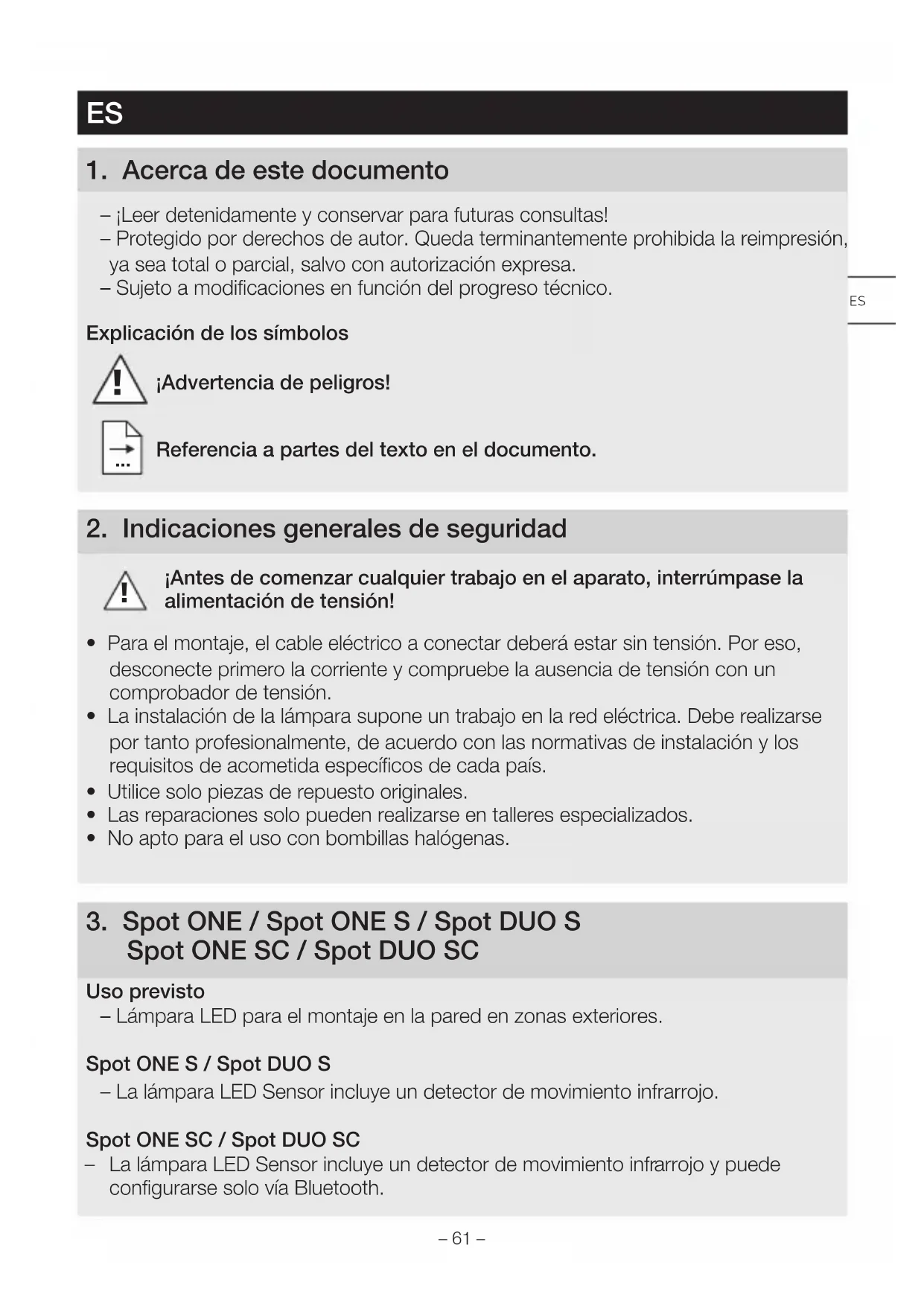 Spot ONESC / Spot DUO SC Uso previsto – Lámpara LED para el montaje en la pared en zonas exteriores. Spot ONES / Spot DUOS – La lámpara LED Sensor incluye un detector de movimiento infrarrojo. Spot ONESC / Spot DUOSC – La lámpara LED Sensor incluye un detector de movimiento infrarrojo y puede configurarse solo vía Bluetooth. ES– 62 – Uso no previsto – Lámpara LED no atenuable No atenuable Volumen de suministro Spot ONE (Fig.3.1) – Lámpara – Tres tornillos – Tres espigas – Tres distanciadores Volumen de suministro Spot DUO (Fig.3.2) – Lámpara – Cuatro tornillos – Cuatro espigas – Cuatro distanciadores Dimensiones del producto Spot ONE (Fig.3.3) Spot DUO (Fig.3.4) Resumen de producto (Fig.3.5) A Soporte de pared B Borne de conexión C Tornillo de fijación D Pie de lámpara E Carcasa de la lámpara F Regulación crepuscular (solo Spot ONES / DUOS) G Temporización (solo Spot ONES / DUO S) Campo de detección Spot ONES / DUOS (Fig. 3.6 – 3.8) Distribución de la intensidad luminosa (Fig. 3.9)