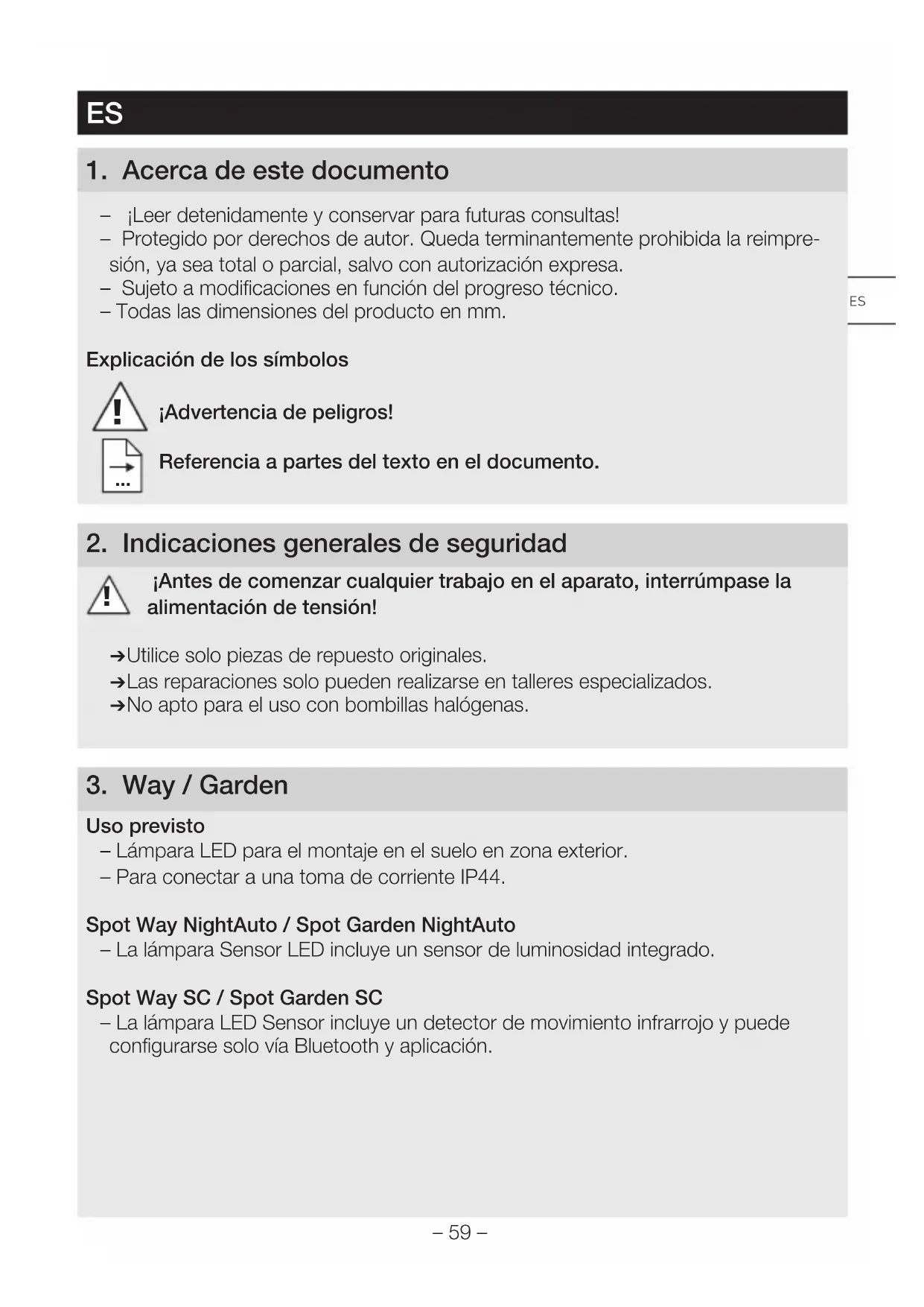 Uso previsto – Lámpara LED para el montaje en el suelo en zona exterior. – Para conectar a una toma de corriente IP44. Spot Way NightAuto/Spot Garden NightAuto – La lámpara Sensor LED incluye un sensor de luminosidad integrado. Spot Way SC/Spot Garden SC – La lámpara LED Sensor incluye un detector de movimiento infrarrojo y puede configurarse solo vía Bluetooth y aplicación. ES– 60 – Uso no previsto – Lámpara LED no atenuable No atenuable Volumen de suministro Spot Way (Fig. 3.1) – Lámpara incl. columna, placa base y cable de conexión con clavija – Tres tornillos – Tres espigas Volumen de suministro Spot Garden (Fig. 3.2) – Lámpara incl. cable de conexión con clavija – Estaca – Dos tornillos Dimensiones del producto Spot Way (Fig.3.3) Dimensiones del producto Spot Garden (Fig.3.4) Resumen de productos (Fig.3.5 – 3.10) A Carcasa de lámpara B Detector de movimiento (solo Spot Way / Garden SC) C Sensor de luminosidad (solo Spot Way/Garden NightAuto) D Regulación crepuscular (solo Spot Way/Garden NightAuto) E Columna con placa base (solo Spot Way) F Estaca (solo Spot Garden) G Cable de conexión con clavija Campo de detección Spot Way / Garden SC (Fig. 3.11 – 3.16) Distribución de la intensidad luminosa (Fig. 3.17)
