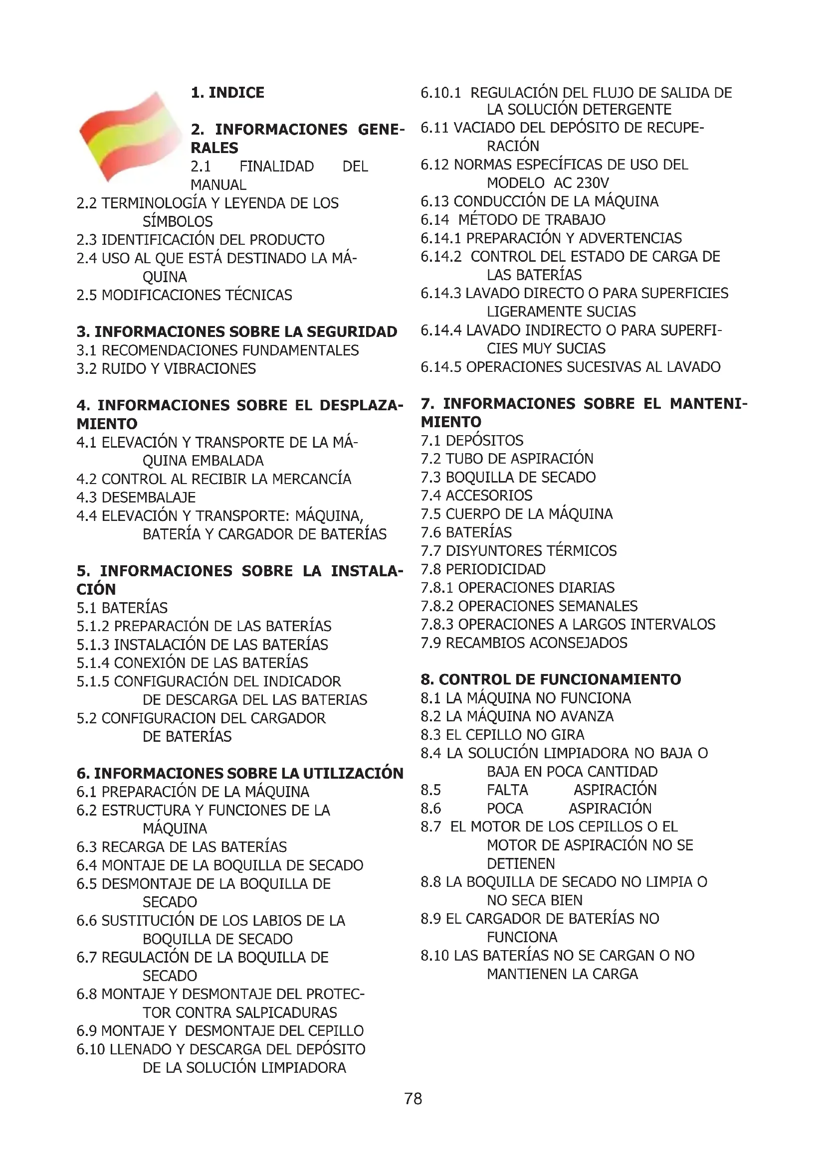 Para facilitar la consulta y lectura de los temas de interés, consulte el índice que se halla al inicio de la sección escrita en su idioma. El presente manual ha sido redactado por el fabri- cante y forma parte integrante del producto, y como tal debe conservarse con cuidado durante toda la vida de la máquina hasta su demolición. El cliente debe asegurarse de que los operarios hayan leído y comprendido el contenido del pre- sente manual, a fin de que puedan atenerse escru- pulosamente las instrucciones descritas en el mismo. Para obtener los mejores resultados en términos de seguridad, prestaciones, eficacia y duración del pro- ducto que han adquirido es fundamental respetar siempre las indicaciones proporcionadas en este manual. El incumplimiento de estas reglas puede provocar daños a las personas, a la máquina, a la superficie lavada y al ambiente, que en ningún caso podrán imputarse al fabricante. El presente manual se refiere detalladamente a la máquina y proporciona indicaciones y descripcio- nes exclusivamente a las baterías y cargadores de baterías (opcionales) que disponemos. Las baterías y el cargador de baterías son compo- nentes fundamentales para completar la máquina y condiciones el funcionamiento de la misma en tér- minos de autonomía y prestaciones. Sólo la cor- recta combinación entre los dos accesorios (baterías y cargador de baterías) permite obtener las máximas prestaciones y evita grandes pérdidas de dinero. Para más informaciones al respecto es esencial remitirse a los manuales específicos de las baterías y de los cargadores de baterías. Los cargadores de baterías y las baterías que su- gerimos (opcionales) aseguran la mejor combina- ción con la máquina y, además de una extraordinaria versatilidad (cargadores de baterías), ofrecen estándares cualitativos y prestaciones en la cumbre de la categoría.