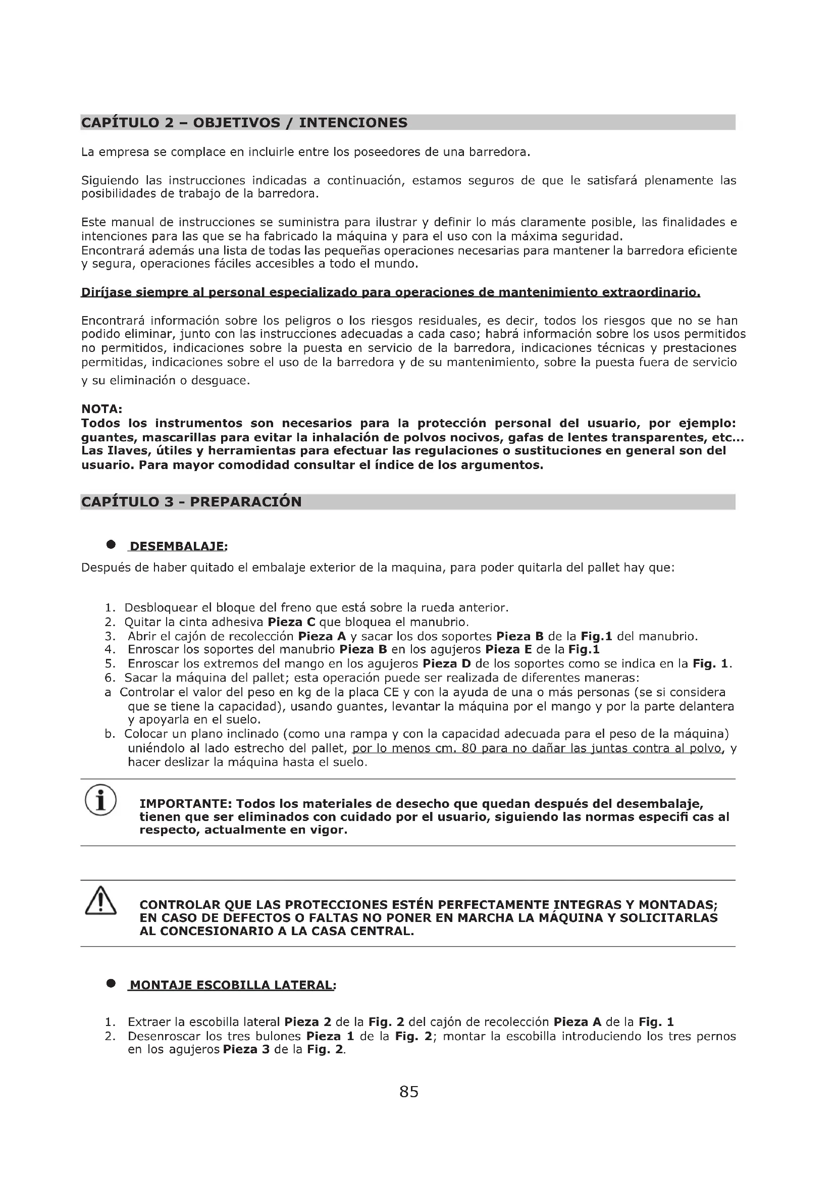 La empresa se complace en incluirle entre los poseedores de una barredora. Siguiendo las instrucciones indicadas a continuación, estamos seguros de que le satisfará plenamente las posibilidades de trabajo de la barredora. Este manual de instrucciones se suministra para ilustrar y definir lo más claramente posible, las finalidades e intenciones para las que se ha fabricado la máquina y para el uso con la máxima seguridad. Encontrará además una lista de todas las pequeñas operaciones necesarias para mantener la barredora eficiente y segura, operaciones fáciles accesibles a todo el mundo. Diríjase siempre al personal especializado para operaciones de mantenimiento extraordinario. Encontrará información sobre los peligros o los riesgos residuales, es decir, todos los riesgos que no se han podido eliminar, junto con las instrucciones adecuadas a cada caso; habrá información sobre los usos permitidos no permitidos, indicaciones sobre la puesta en servicio de la barredora, indicaciones técnicas y prestaciones permitidas, indicaciones sobre el uso de la barredora y de su mantenimiento, sobre la puesta fuera de servicio y su eliminación o desguace. NOTA: Todos los instrumentos son necesarios para la protección personal del usuario, por ejemplo: guantes, mascarillas para evitar la inhalación de polvos nocivos, gafas de lentes transparentes, etc... Las Ilaves, útiles y herramientas para efectuar las regulaciones o sustituciones en general son del usuario. Para mayor comodidad consultar el índice de los argumentos.