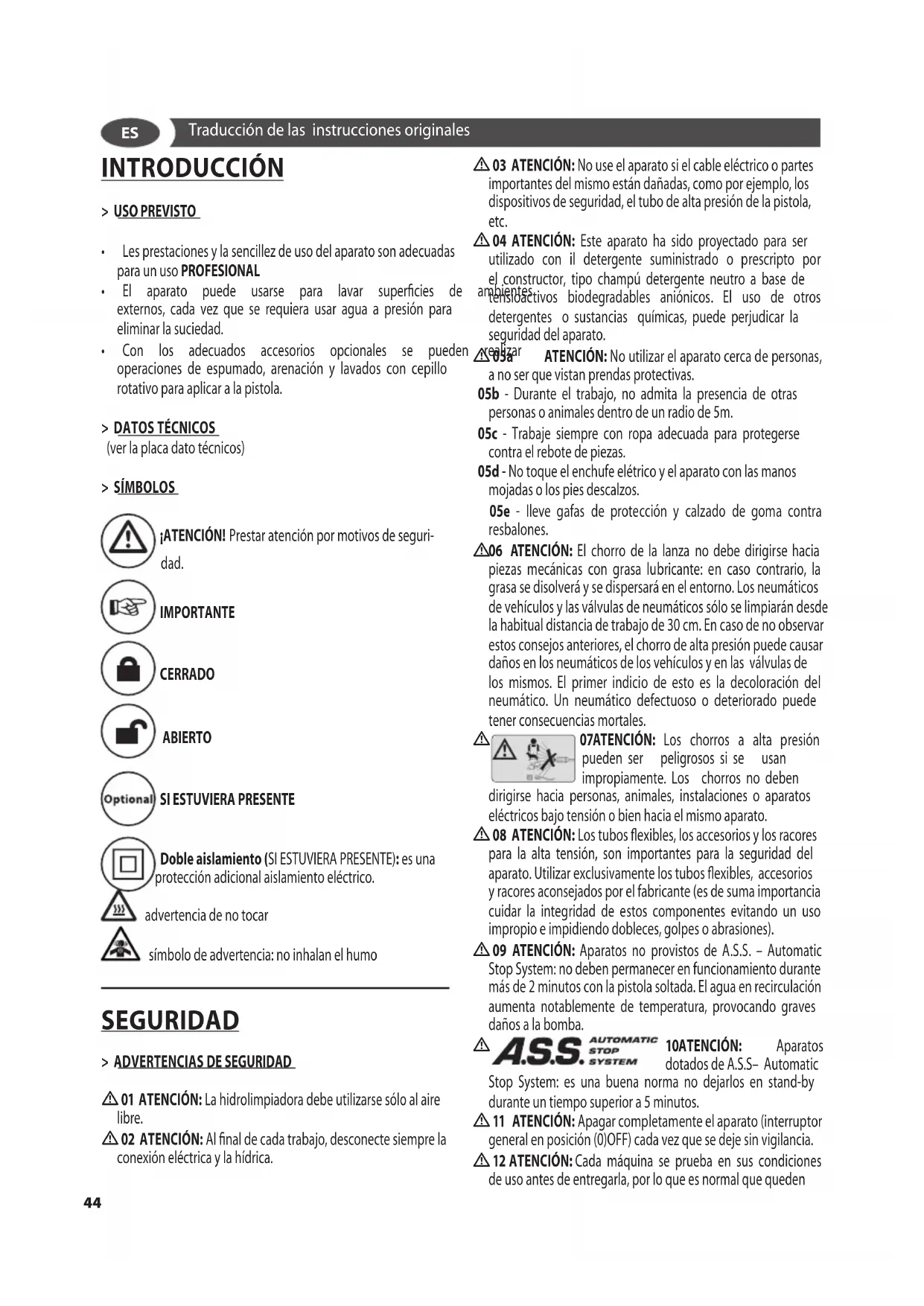 09 ATENCIÓN: Aparatos no provistos de A.S.S. – Automatic Stop System: no deben permanecer en funcionamiento durante más de 2 minutos con la pistola soltada. El agua en recirculación aumenta notablemente de temperatura, provocando graves daños a la bomba.