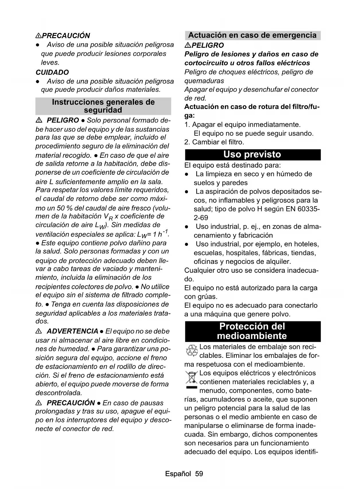 • I firmatari agiscono per incarico e con dele- ga della direzione. Responsabile della documentazione: A. Haag Kärcher Industrial Vacuuming GmbH Robert-Bosch-Straße 4-8 73550 Waldstetten (Germany) Tel.: +49 7171 94888-0 Fax: +49 7171 94888-528 Waldstetten, 24/04/01 Índice de contenidos Avisos generales Antes de usar su equipo por primera vez, lea el presente manual original, proceda siempre según sus indicaciones y guárdelo para usos pos- teriores o para el siguiente propietario. ● Antes de la primera puesta en funciona- miento lea sin falta las instrucciones de uso y las instrucciones de seguridad n.º 5.956-249.0. ● En caso de no respetar el manual de ins- trucciones o las instrucciones de seguri- dad, se pueden causar daños al equipo y crear peligros para el operario y otras personas. ● Informe inmediatamente a su distribui- dor si se han producido daños durante el transporte. Instrucciones de seguridad Niveles de peligro PELIGRO ● Aviso de un peligro inminente que produ- ce lesiones corporales graves o la muer- te. 몇 ADVERTENCIA ● Aviso de una posible situación peligrosa que puede producir lesiones corporales graves o la muerte. Avisos generales p. 58
