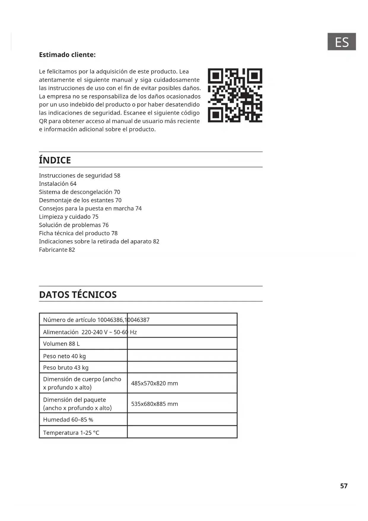 Número de artículo 10046386,10046387 Alimentación 220-240 V ~ 50-60 Hz Volumen 88 L Peso neto 40 kg Peso bruto 43 kg Dimensión de cuerpo (ancho x profundo x alto) 485x570x820 mm Dimensión del paquete (ancho x profundo x alto) 535x680x885 mm Humedad 60–85 % Temperatura 1-25 °C Instrucciones de seguridad 58 Instalación 64 Sistema de descongelación 70 Desmontaje de los estantes 70 Consejos para la puesta en marcha 74 Limpieza y cuidado 75 Solución de problemas 76 Ficha técnica del producto 78 Indicaciones sobre la retirada del aparato 82 Fabricante 8258