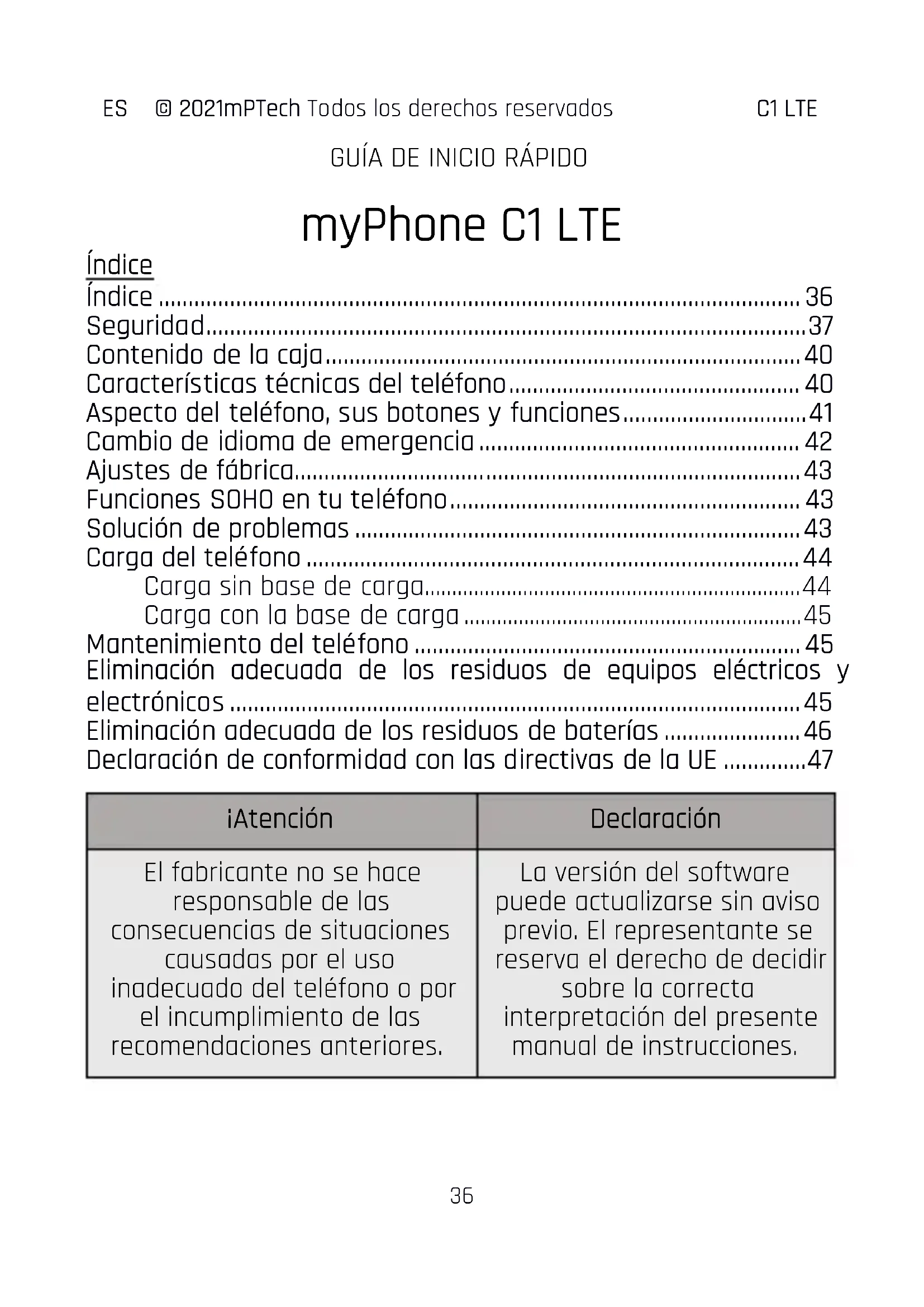 - Declaración de conformidad con las directivas de la UE ¡Atención Declaración El fabricante no se hace responsable de las consecuencias de situaciones causadas por el uso inadecuado del teléfono o por el incumplimiento de las recomendaciones anteriores. La versión del software puede actualizarse sin aviso previo. El representante se reserva el derecho de decidir sobre la correcta interpretación del presente manual de instrucciones.ES © 2021mPTech Todos los derechos reservados C1 LTE p. 47