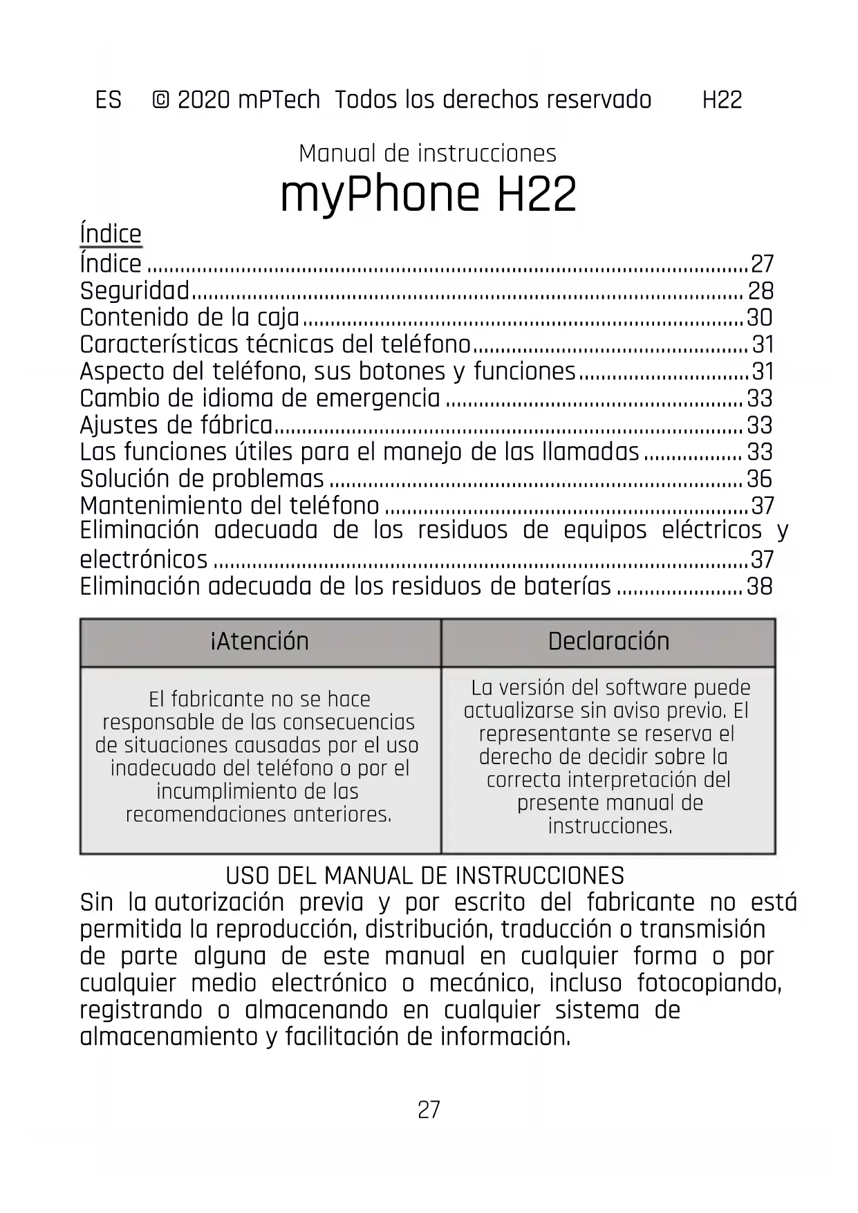 - Manual de instrucciones myPhone H22 Índice Índice p. 27