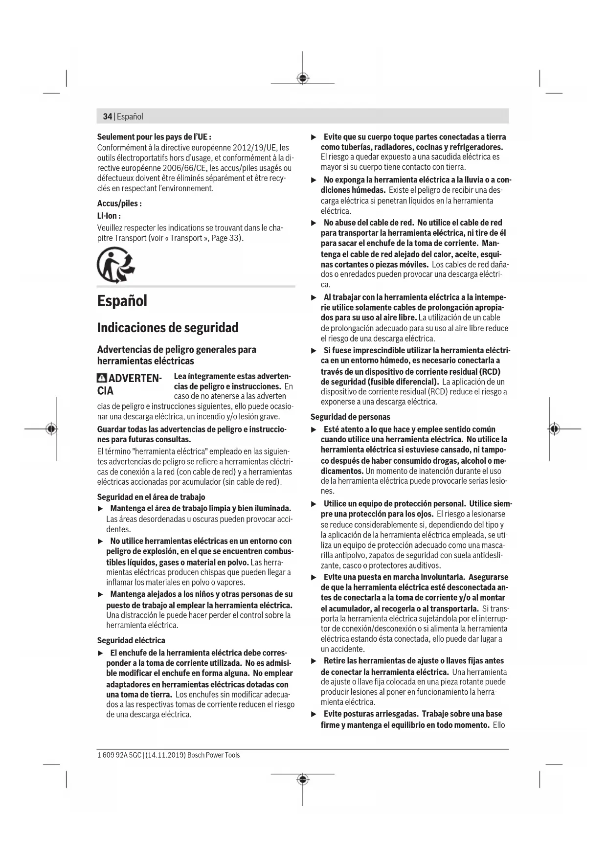1,5 1,5 El nivel de vibraciones y el valor de emisiones de ruidos indi- cados en estas instrucciones han sido determinados según un procedimiento de medición normalizado y pueden servir como base de comparación con otras herramientas eléctri- cas. También son adecuados para estimar provisionalmente la emisión de vibraciones y ruidos. El nivel de vibraciones y el valor de emisiones de ruidos indi- cados han sido determinados para las aplicaciones principa- les de la herramienta eléctrica. Por ello, el nivel de vibracio- nes y el valor de emisiones de ruidos pueden ser diferentes si la herramienta eléctrica se utiliza para otras aplicaciones, con útiles diferentes, o si el mantenimiento de la misma fue- se deficiente. Ello puede suponer un aumento drástico de la emisión de vibraciones y de ruidos durante el tiempo total de trabajo. Para determinar con exactitud las emisiones de vibraciones y de ruidos, es necesario considerar también aquellos tiem- pos en los que el aparato esté desconectado, o bien, esté en funcionamiento, pero sin ser utilizado realmente. Ello puede suponer una disminución drástica de las emisiones de vibra- ciones y de ruidos durante el tiempo total de trabajo. Fije unas medidas de seguridad adicionales para proteger al usuario de los efectos por vibraciones, como por ejemplo: Mantenimiento de la herramienta eléctrica y de los útiles, conservar calientes las manos, organización de las secuen- cias de trabajo. Montaje u Antes de realizar cualquier trabajo en el aparato (p. ej. mantenimiento, cambio de útil, etc.), así como al transportarla y guardarla, poner el selector de sentido de giro en la posición central. En caso contrario podría accidentarse al accionar fortuitamente el interruptor de conexión/desconexión. Carga del acumulador u Utilice únicamente los cargadores que se enumeran en los datos técnicos. Solamente estos cargadores han sido especialmente adaptados a los acumuladores de io- nes de litio empleados en su herramienta eléctrica. Indicación: El acumulador se suministra parcialmente carga- do. Con el fin de obtener la plena potencia del acumulador, antes de su primer uso, cárguelo completamente en el carga- dor. El acumulador de iones de litio puede recargarse siempre que se quiera, sin que ello merme su vida útil. Una interrup- ción del proceso de carga no afecta al acumulador. El acumulador de iones de litio está protegido contra descar- ga total gracias al sistema de protección electrónica de cel- das "Electronic Cell Protection (ECP)". Si el acumulador está descargado, un circuito de protección se encarga de desco- nectar la herramienta eléctrica. El útil deja de moverse. u En caso de una desconexión automática de la herra- mienta eléctrica no mantenga accionado el interrup- tor de conexión/desconexión. El acumulador podría da- ñarse. Observe las indicaciones referentes a la eliminación. Desmontaje del acumulador El acumulador(14) dispone de dos etapas de enclavamiento para evitar que se salga en el caso de un accionamiento acci- dental de la tecla de desenclavamiento del acumulador (10). Mientras el acumulador está montado en la herramienta eléctrica, permanece retenido en esa posición por un resor- te. – Para la extracción del acumulador (14), presione la tecla de desenclavamiento (10) y retire el acumulador de la he- rramienta eléctrica. No proceda con brusquedad. Indicador del estado de carga del acumulador Los LEDs verdes del indicador del estado de carga del acu- mulador indican el estado de carga del acumulador. Por mo- tivos de seguridad, la consulta del estado de carga es solo posible con la herramienta eléctrica parada. Presione la tecla del indicador de estado de carga o , para indicar el estado de carga. Esto también es posible con el acumulador desmontado. Si tras presionar la tecla del indicador de estado de carga no se enciende ningún LED, significa que el acumulador está defectuoso y debe sustituirse. Tipo de acumulador GBA18V... LEDs Capacidad Luz permanente 3× verde 60−100% Luz permanente 2× verde 30−60% Luz permanente 1× verde 5−30% Luz intermitente 1× verde 0−5% Tipo de acumulador ProCORE18V... LEDs Capacidad Luz permanente 5× verde 80−100 % 1 609 92A 5GC | (14.11.2019) Bosch Power ToolsEspañol | 39 LEDs Capacidad Luz permanente 4× verde 60−80 % Luz permanente 3× verde 40−60 % Luz permanente 2× verde 20−40 % Luz permanente 1× verde 5−20 % Luz intermitente 1× verde 0−5 % Empuñadura adicional u Utilice su herramienta eléctrica sólo con la empuñadu- ra adicional (19). Girar la empuñadura adicional (verfiguraA) La empuñadura adicional (19) la puede girar a voluntad, pa- ra lograr una postura de trabajo segura y libre de fatiga. – Gire la parte inferior de la empuñadura adicional (19) en sentido antihorario y gire la empuñadura adicional (19) a la posición deseada. Luego, vuelva a apretar de nuevo la empuñadura adicional (19) en sentido horario. Observe que la abrazadera de la empuñadura adicional quede alojada en la ranura de la carcasa prevista para tal fin. Selección del portabrocas y de los útiles Para taladrar con percusión y para cincelar se precisan útiles SDS-plus, que se montan en el portabrocas SDS-plus. Para taladrar sin percusión en madera, metal, cerámica y plástico, así como para atornillar se utilizan útiles sin vástago SDS-plus (p. ej. brocas de vástago cilíndrico). Para estos úti- les se precisa un portabrocas de sujeción rápida o un porta- brocas de corona dentada. Montaje/desmontaje del portabrocas de corona dentada (GBH18V-26) Montaje del portabrocas con corona dentada (ver figura
