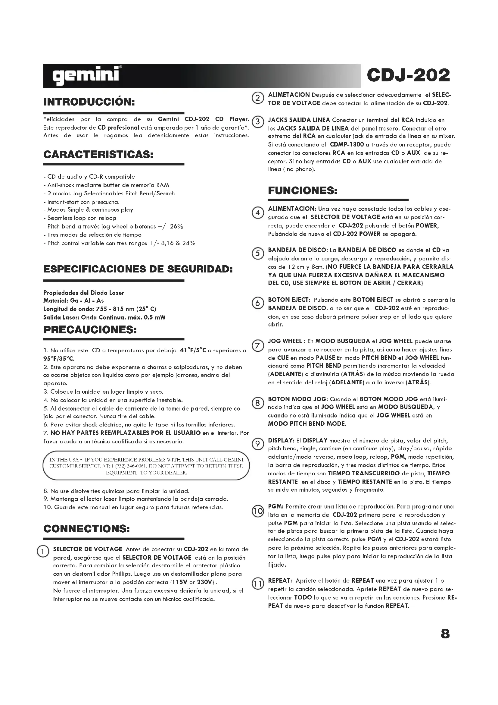 95°F/35°C.2. Este aparato no debe exponerse a chorros o salpicaduras, y no debencolocarse objetos con líquidos como por ejemplo jarrones, encima delaparato.3. Coloque la unidad en lugar limpio y seco.4. No colocar la unidad en una superficie inestable.5. Al desconectar el cable de corriente de la toma de pared, siempre co-jalo por el conector. Nunca tire del cable.6. Para evitar shock eléctrico, no quite la tapa ni los tornillos inferiores. 7. NO HAY PARTES REEMPLAZABLES POR EL USUARIO en el interior. Porfavor acuda a un técnico cualificado si es necesario. 8. No use disolventes químicos para limpiar la unidad. 9. Mantenga el lector laser limpio manteniendo la bandeja cerrada.10. Guarde este manual en lugar seguro para futuras referencias. INTRODUCCIÓN: IN THE USA ~ IF YOU EXPERIENCE PROBLEMS WITH THIS UNIT CALL GEMINI CUSTOMER SERVICE AT: 1 (732) 346-0061. DO NOT ATTEMPT TO RETURN THISEEQUIPMENT TO YOUR DEALER. CDJ-202