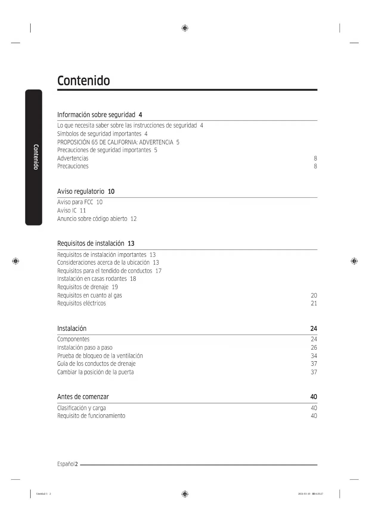 Precauciones de seguridad importantes 5 Advertencias 8 Precauciones 8 Aviso regulatorio 10 Aviso para FCC 10 Aviso IC 11 Anuncio sobre código abierto 12 Requisitos de instalación 13 Requisitos de instalación importantes 13 Consideraciones acerca de la ubicación 13 Requisitos para el tendido de conductos 17 Instalación en casas rodantes 18 Requisitos de drenaje 19 Requisitos en cuanto al gas 20 Requisitos eléctricos 21 Instalación 24 Componentes 24 Instalación paso a paso 26 Prueba de bloqueo de la ventilación 34 Guía de los conductos de drenaje 37 Cambiar la posición de la puerta 37 Antes de comenzar 40 Clasicación y carga 40 Requisito de funcionamiento 40 Untitled-5 2 2021-03-10 6:25:27Español 3 Contenido Funcionamiento 41 Panel de control 41 Sencillos pasos para comenzar 44 Descripción del ciclo 45 Tabla de ciclos 47 Guía de ciclos 50 Funciones especiales 51 Mantenimiento 54 Limpieza 54 Solución de problemas 55 Vericaciones 55 Códigos de información 58 Especicaciones 60 Tabla de indicaciones sobre telas 60 Protección del medio ambiente 61 Hoja de especicaciones 62 Untitled-5 3 2021-03-10 6:25:27CONSERVE ESTAS INSTRUCCIONES Español4 Información sobre seguridad Felicitaciones por la compra de la nueva secadora Samsung. Este manual contiene información importante acerca de la instalación, el uso y el cuidado del electrodoméstico. Lea detenidamente estas instrucciones a n de aprovechar al máximo los múltiples benecios y funciones de la secadora. Lo que necesita saber sobre las instrucciones de seguridad Lea este manual detenidamente para aprender a utilizar con seguridad y ecacia todas las características y funciones de su nuevo electrodoméstico. Conserve el manual en un lugar seguro cerca del electrodoméstico para consultas futuras. Utilice este electrodoméstico solo para el propósito para el que fue destinado como se describe en este manual. Las advertencias y las instrucciones de seguridad importantes de este manual no cubren todas las posibles condiciones y situaciones que pueden ocurrir. Es su responsabilidad actuar con sentido común, precaución y cuidado cuando instale, realice el mantenimiento y ponga en funcionamiento la secadora. Puesto que las siguientes instrucciones de funcionamiento sirven para varios modelos, las características de su secadora pueden diferir ligeramente de las que se describen en este manual y es posible que no todos los signos de advertencia sean aplicables. Si tiene alguna consulta o duda, comuníquese con el centro de servicio más cercano o busque ayuda e información en línea en www.samsung.com. Símbolos de seguridad importantes Los íconos y las señales incluidas en este manual del usuario signican lo siguiente: ADVERTENCIA Peligros o prácticas inseguras que podrían causar lesiones físicas graves o la muerte y/o daños materiales. PRECAUCIÓN Peligros o prácticas inseguras que podrían causar lesiones físicas y/o daños materiales. NOTA Indica que existe el riesgo de lesiones físicas o daños materiales. Estas señales de advertencia están aquí para evitar que usted u otras personas sufran lesiones. Siga las instrucciones completamente. Después de leer este manual, guárdelo en un lugar seguro para consultas futuras. Lea todas las instrucciones antes de usar el electrodoméstico. Al igual que con cualquier equipo que usa electricidad y piezas movibles, existen riesgos potenciales. Para usar este electrodoméstico en forma segura, familiarícese con su funcionamiento y manéjelo con cuidado cuando lo use. Información sobre seguridad Untitled-5 4 2021-03-10 6:25:27CONSERVE ESTAS INSTRUCCIONES Español 5 Información sobre seguridad ADVERTENCIA - Riesgo de incendio