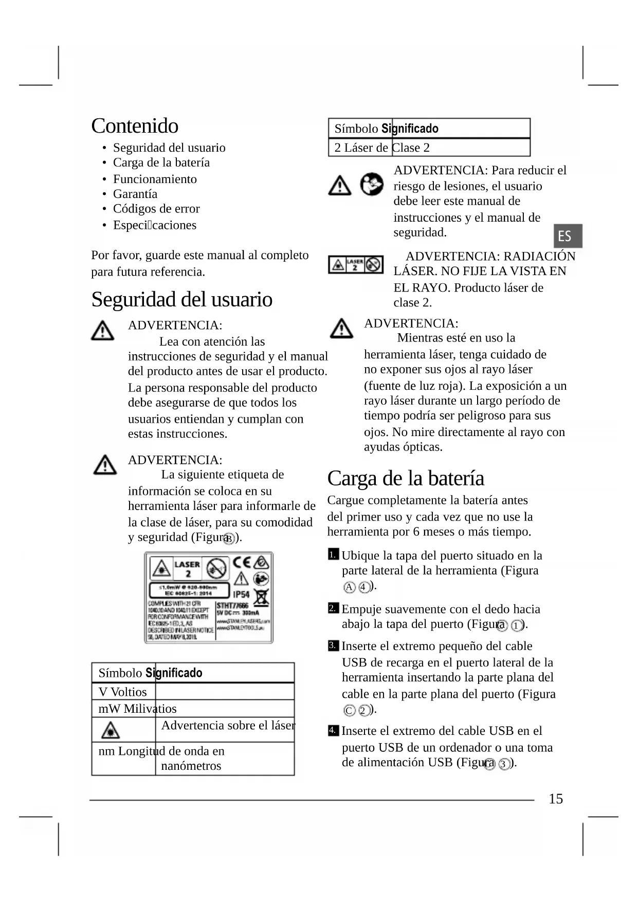 - Especicaciones Por favor, guarde este manual al completo para futura referencia. Seguridad del usuario ADVERTENCIA: Lea con atención las instrucciones de seguridad y el manual del producto antes de usar el producto. La persona responsable del producto debe asegurarse de que todos los usuarios entiendan y cumplan con estas instrucciones. ADVERTENCIA: La siguiente etiqueta de información se coloca en su herramienta láser para informarle de la clase de láser, para su comodidad y seguridad (Figura
