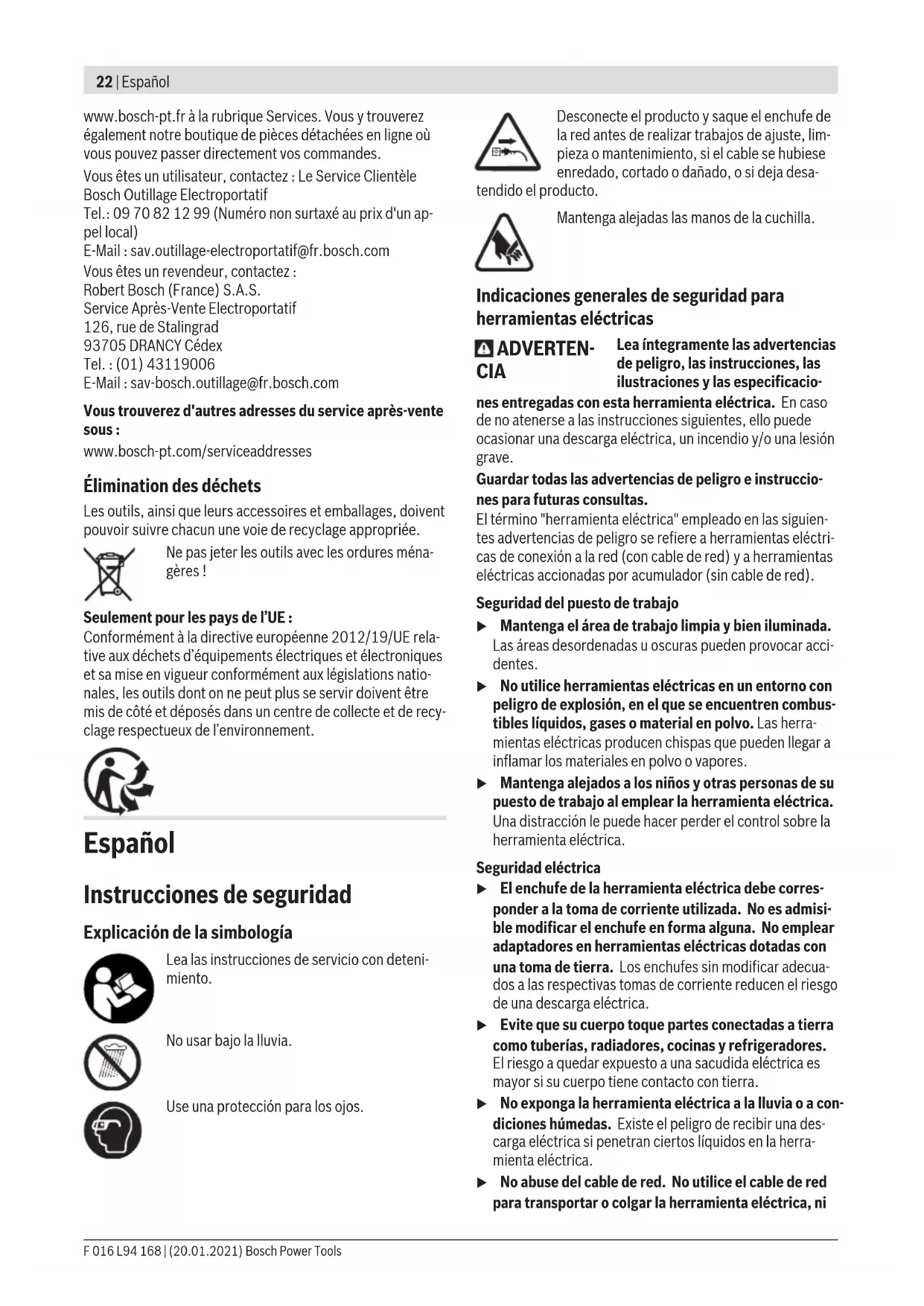 Mode d’emploi u Tenir compte de la tension du réseau! La tension de la source de courant doit coïncider avec les indications se trouvant sur la plaque signalétique de l’appareil. Mettre en marche/arrêter (voir figures C et D) Pour mettre en marche, appuyer d’abord sur le bouton de déverrouillage (3) et le maintenir enfoncé. Appuyer ensuite sur l’interrupteur Marche / Arrêt (2) et le maintenir appuyé. Pour arrêter l’appareil, relâcher le bouton de verrouillage (3) puis l’interrupteur Marche/Arrêt (2). Fonction scie Bien que l’écartement entre les dents permette des coupes de branche d’une épaisseur allant jusqu’à un Ø de 20mm au maximum, l’extrémité de la pointe de la barre porte-lame est conçue pour des coupes allant jusqu’à 25mm de Ø. Travail avec le taille-haie (voir figure E) Avancer le taille-haie uniformément le long de la ligne de coupe. La barre porte-lames est munie de lames des deux côtés et permet de tailler dans les deux sens ou d’effectuer des mouvements de va-et-vient. Couper d’abord les côtés latéraux de la haie, puis le bord su- périeur. Afin d’obtenir un aspect impeccable, nous vous recomman- dons de tailler dans le sens de croissance de bas en haut. Au F 016 L94 168 | (20.01.2021) Bosch Power Toolsloading-circle-122 | Español www.bosch-pt.fr à la rubrique Services. Vous y trouverez également notre boutique de pièces détachées en ligne où vous pouvez passer directement vos commandes. Vous êtes un utilisateur, contactez : Le Service Clientèle Bosch Outillage Electroportatif Tel.: 0970821299 (Numéro non surtaxé au prix d'un ap- pel local) E-Mail : sav.outillage-electroportatif@fr.bosch.com Vous êtes un revendeur, contactez : Robert Bosch (France) S.A.S. Service Après-Vente Electroportatif 126, rue de Stalingrad 93705 DRANCY Cédex Tel. : (01) 43119006 E-Mail : sav-bosch.outillage@fr.bosch.com Vous trouverez d'autres adresses du service après-vente sous: www.bosch-pt.com/serviceaddresses Élimination des déchets Les outils, ainsi que leurs accessoires et emballages, doivent pouvoir suivre chacun une voie de recyclage appropriée. Ne pas jeter les outils avec les ordures ména- gères! Seulement pour les pays de l’UE : Conformément à la directive européenne 2012/19/UE rela- tive aux déchets d’équipements électriques et électroniques et sa mise en vigueur conformément aux législations natio- nales, les outils dont on ne peut plus se servir doivent être mis de côté et déposés dans un centre de collecte et de recy- clage respectueux de l’environnement. Español Instrucciones de seguridad Explicación de la simbología Lea las instrucciones de servicio con deteni- miento. No usar bajo la lluvia. Use una protección para los ojos. Desconecte el producto y saque el enchufe de la red antes de realizar trabajos de ajuste, lim- pieza o mantenimiento, si el cable se hubiese enredado, cortado o dañado, o si deja desa- tendido el producto. Mantenga alejadas las manos de la cuchilla. Indicaciones generales de seguridad para herramientas eléctricas ADVERTEN- CIA Lea íntegramente las advertencias de peligro, las instrucciones, las ilustraciones y las especificacio- nes entregadas con esta herramienta eléctrica. En caso de no atenerse a las instrucciones siguientes, ello puede ocasionar una descarga eléctrica, un incendio y/o una lesión grave. Guardar todas las advertencias de peligro e instruccio- nes para futuras consultas. El término "herramienta eléctrica" empleado en las siguien- tes advertencias de peligro se refiere a herramientas eléctri- cas de conexión a la red (con cable de red) y a herramientas eléctricas accionadas por acumulador (sin cable de red). Seguridad del puesto de trabajo u Mantenga el área de trabajo limpia y bien iluminada. Las áreas desordenadas u oscuras pueden provocar acci- dentes. u No utilice herramientas eléctricas en un entorno con peligro de explosión, en el que se encuentren combus- tibles líquidos, gases o material en polvo. Las herra- mientas eléctricas producen chispas que pueden llegar a inflamar los materiales en polvo o vapores. u Mantenga alejados a los niños y otras personas de su puesto de trabajo al emplear la herramienta eléctrica. Una distracción le puede hacer perder el control sobre la herramienta eléctrica. Seguridad eléctrica u El enchufe de la herramienta eléctrica debe corres- ponder a la toma de corriente utilizada. No es admisi- ble modificar el enchufe en forma alguna. No emplear adaptadores en herramientas eléctricas dotadas con una toma de tierra. Los enchufes sin modificar adecua- dos a las respectivas tomas de corriente reducen el riesgo de una descarga eléctrica. u Evite que su cuerpo toque partes conectadas a tierra como tuberías, radiadores, cocinas y refrigeradores. El riesgo a quedar expuesto a una sacudida eléctrica es mayor si su cuerpo tiene contacto con tierra. u No exponga la herramienta eléctrica a la lluvia o a con- diciones húmedas. Existe el peligro de recibir una des- carga eléctrica si penetran ciertos líquidos en la herra- mienta eléctrica. u No abuse del cable de red. No utilice el cable de red para transportar o colgar la herramienta eléctrica, ni F 016 L94 168 | (20.01.2021) Bosch Power ToolsEspañol | 23 tire de él para sacar el enchufe de la toma de corrien- te. Mantenga el cable de red alejado del calor, aceite, esquinas cortantes o piezas móviles. Los cables de red dañados o enredados pueden provocar una descarga eléctrica. u Al trabajar con la herramienta eléctrica a la intempe- rie utilice solamente cables de prolongación apropia- dos para su uso al aire libre. La utilización de un cable de prolongación adecuado para su uso en exteriores re- duce el riesgo de una descarga eléctrica. u Si fuese imprescindible utilizar la herramienta eléctri- ca en un entorno húmedo, es necesario conectarla a través de un dispositivo de corriente residual (RCD) de seguridad (fusible diferencial
