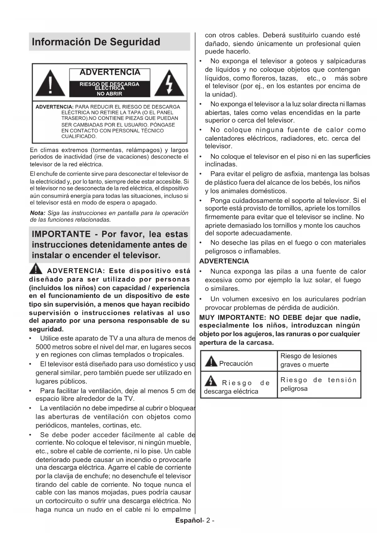 geridas o estar dentro de cualquier parte del cuerpo, busque atención médica inmediata. – – – – – – – – – – – – Un televisor puede caerse y causar lesiones per
