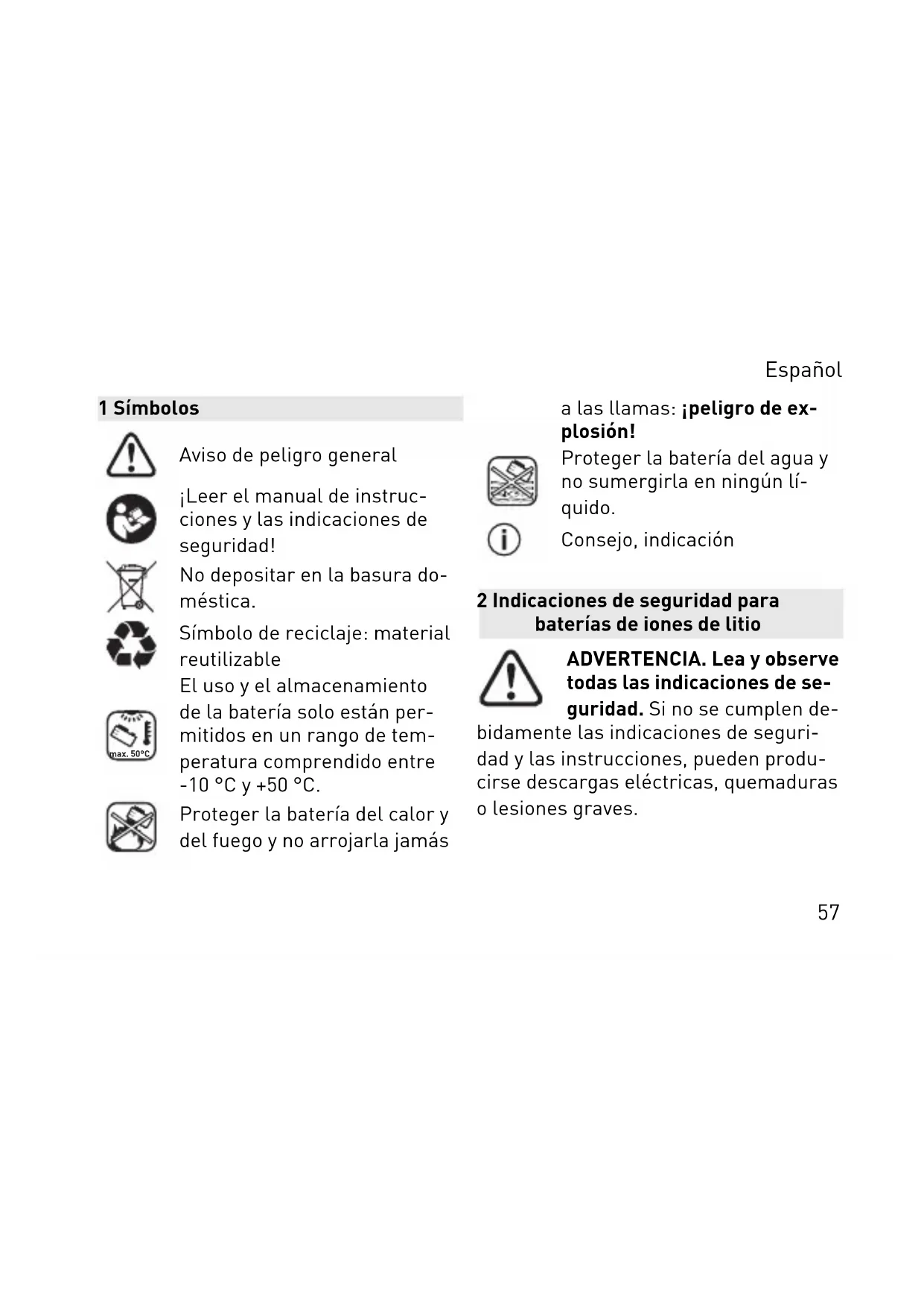 manejo de la batería La batería se suministra a media carga. A fin de garantizar el má Español 62ximo rendimiento de la batería, cargar totalmente la batería en el cargador antes del primer uso. La batería puede cargarse en cualquier momento sin que ello acorte su vida útil. Interrumpir el proceso de carga no daña la batería. Una vez la herramienta se ha desconectado automáti camente, no volver a pulsar el interruptor de conexión y descone xión. La batería puede sufrir daños. La batería está equipada con un control de temperatura que permite la recarga únicamente dentro de un rango de tem peratura comprendido entre 0 °C y 55 °C. De esta manera se alarga su vida útil. – Guardar la batería en un lugar fresco (entre 5 °C y 25 °C) y seco (humedad del aire < 80 %). – No dejar la batería en el vehículo en verano. – Una reducción significativa de la du ración del funcionamiento indica que la batería está agotada y que debe sustituirse. – Observar las indicaciones para la eli minación.