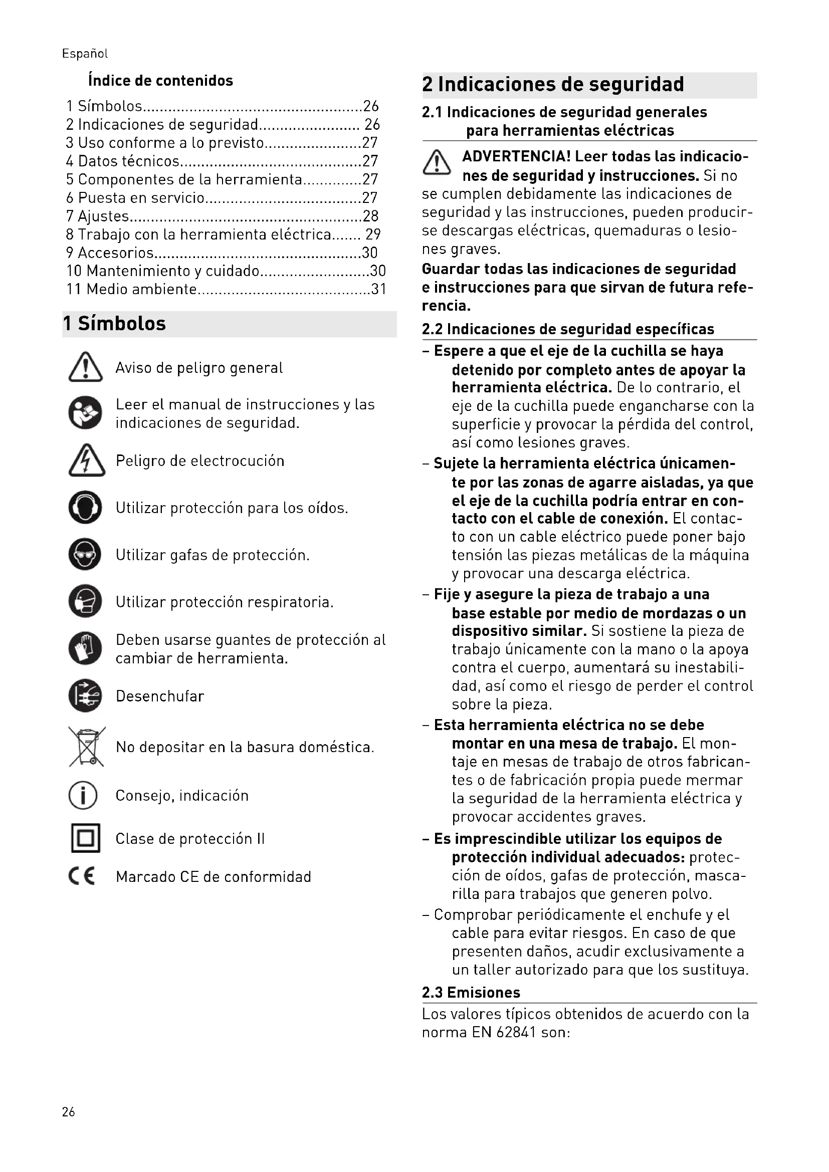 - 11 Ambiente 1 Simboli Avvertenza di pericolo generico Leggere le istruzioni per l’uso e le av vertenze di sicurezza. Avvertenza sulle scariche elettriche Indossare dispositivi di protezione del l'udito. Indossare occhiali protettivi. Indossare dispositivi di protezione del le vie respiratorie. Indossare guanti protettivi quando si cambiano gli utensili. Estrarre la spina di rete. Non smaltire tra i rifiuti domestici. Consiglio, avvertenza Classe di protezione II Marcatura CE di conformità 2 Avvertenze per la sicurezza p. 37