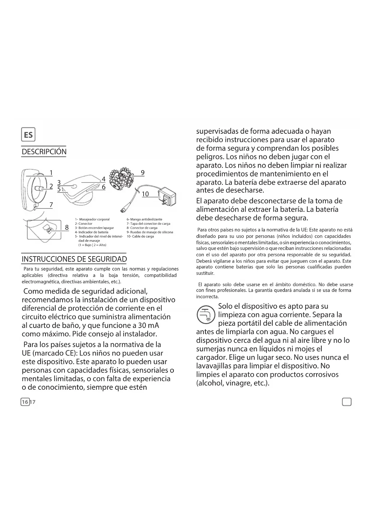 Para tu seguridad, este aparato cumple con las normas y regulaciones aplicables (directiva relativa a la baja tensión, compatibilidad electromagnética, directivas ambientales, etc.). Como medida de seguridad adicional, recomendamos la instalación de un dispositivo diferencial de protección de corriente en el circuito eléctrico que suministra alimentación al cuarto de baño, y que funcione a 30 mA como máximo. Pide consejo al instalador. Para los países sujetos a la normativa de la UE (marcado CE): Los niños no pueden usar este dispositivo. Este aparato lo pueden usar personas con capacidades físicas, sensoriales o mentales limitadas, o con falta de experiencia o de conocimiento, siempre que estén 1- Masajeador corporal2- Conector3- Botón encender/apagar4- Indicador de batería5- Indicador del nivel de intensi-dad de masaje (1 = Bajo | 2 = Alto)6- Mango antideslizante7- Tapa del conector de carga8- Conector de carga9- Ruedas de masaje de silicona10- Cable de carga