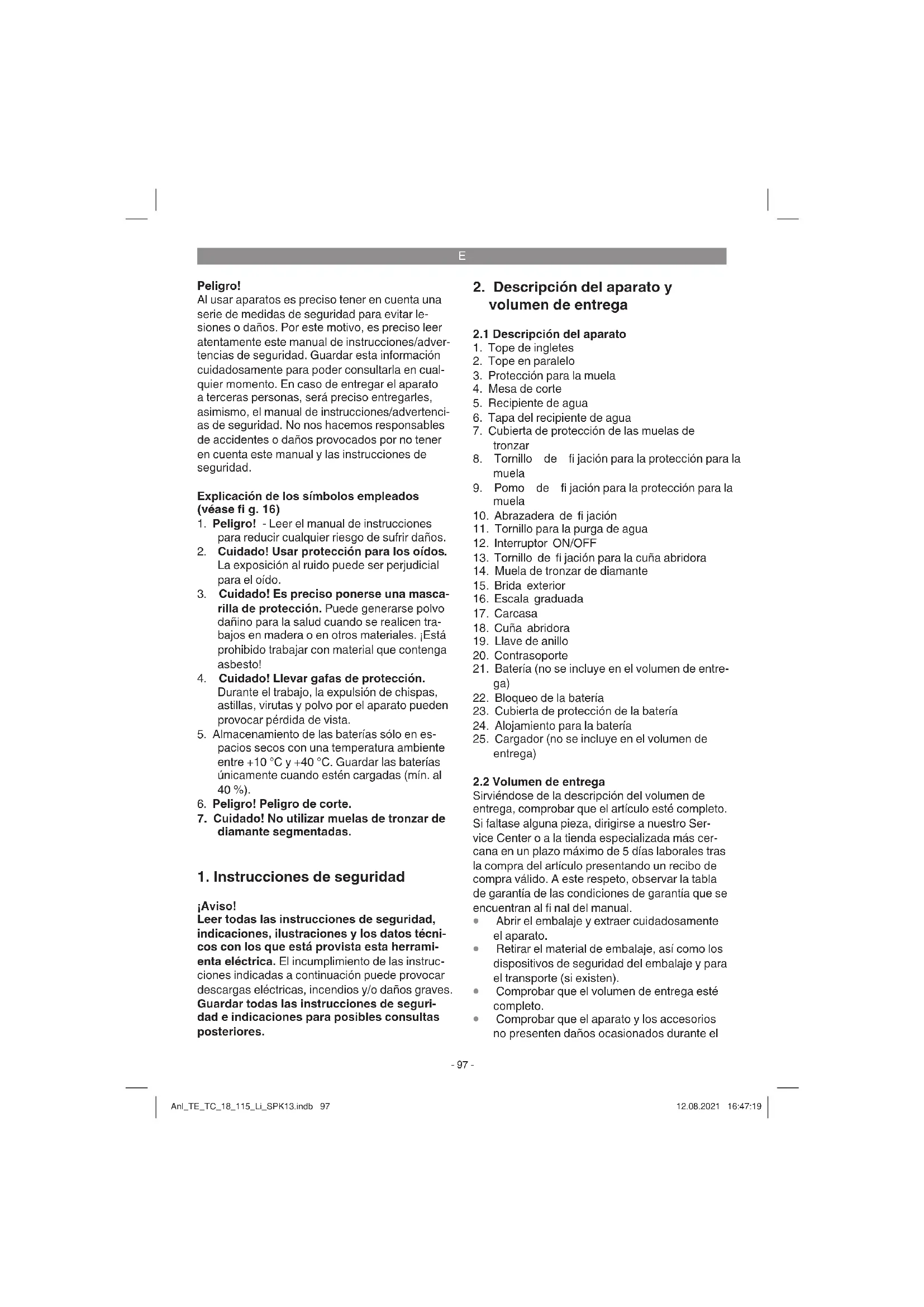 Peligro! Al usar aparatos es preciso tener en cuenta una serie de medidas de seguridad para evitar le- siones o daños. Por este motivo, es preciso leer atentamente este manual de instrucciones/adver- tencias de seguridad. Guardar esta información cuidadosamente para poder consultarla en cual- quier momento. En caso de entregar el aparato a terceras personas, será preciso entregarles, asimismo, el manual de instrucciones/advertenci- as de seguridad. No nos hacemos responsables de accidentes o daños provocados por no tener en cuenta este manual y las instrucciones de seguridad. Explicación de los símbolos empleados (véase fi g. 16)