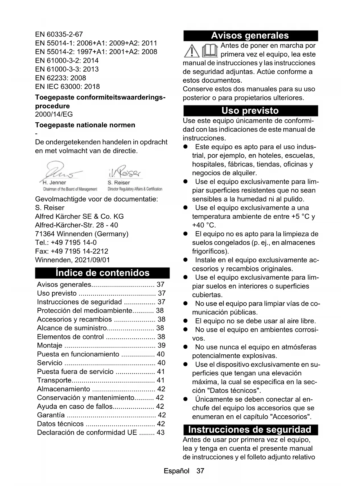 - De ondergetekenden handelen in opdracht en met volmacht van de directie. Gevolmachtigde voor de documentatie: S. Reiser Alfred Kärcher SE & Co. KG Alfred-Kärcher-Str. 28 - 40 71364 Winnenden (Germany) Tel.: +49 7195 14-0 Fax: +49 7195 14-2212 Winnenden, 2021/09/01 Índice de contenidos Avisos generales Antes de poner en marcha por primera vez el equipo, lea este manual de instrucciones y las instrucciones de seguridad adjuntas. Actúe conforme a estos documentos. Conserve estos dos manuales para su uso posterior o para propietarios ulteriores. Uso previsto Use este equipo únicamente de conformi- dad con las indicaciones de este manual de instrucciones. Este equipo es apto para el uso indus- trial, por ejemplo, en hoteles, escuelas, hospitales, fábricas, tiendas, oficinas y negocios de alquiler. Use el equipo exclusivamente para lim- piar superficies resistentes que no sean sensibles a la humedad ni al pulido. Use el equipo exclusivamente a una temperatura ambiente de entre +5 °C y +40 °C. El equipo no es apto para la limpieza de suelos congelados (p. ej., en almacenes frigoríficos). Instale en el equipo exclusivamente ac- cesorios y recambios originales. Use el equipo exclusivamente para lim- piar suelos en interiores o superficies cubiertas. No use el equipo para limpiar vías de co- municación públicas. El equipo no se debe usar al aire libre. No use el equipo en ambientes corrosi- vos. No use nunca el equipo en atmósferas potencialmente explosivas. Use el dispositivo exclusivamente en su- perficies que tengan una elevación máxima, la cual se especifica en la sec- ción "Datos técnicos". Únicamente se deben conectar al en- chufe del equipo los accesorios que se enumeran en el capítulo "Accesorios". Instrucciones de seguridad Antes de usar por primera vez el equipo, lea y tenga en cuenta el presente manual de instrucciones y el folleto adjunto relativo Avisos generales p. 37