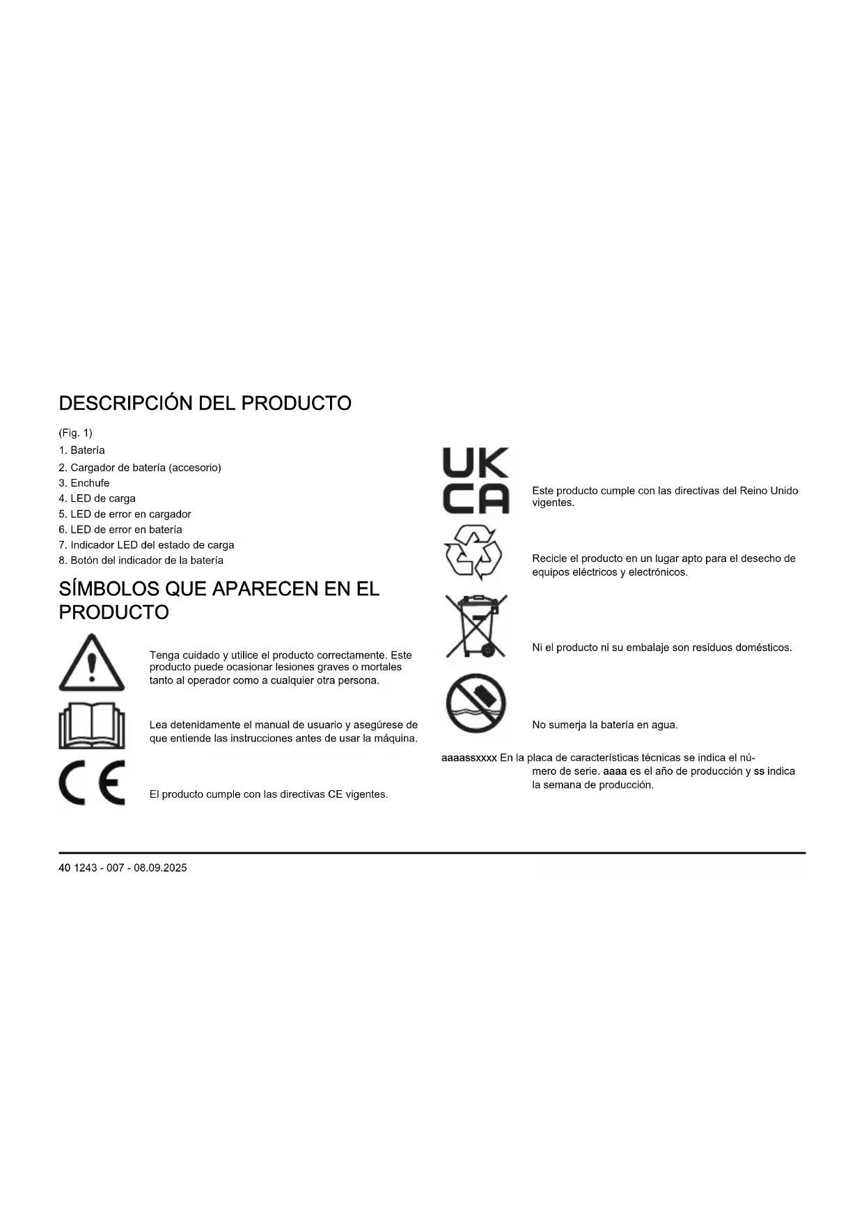 PRODUCTO Tenga cuidado y utilice el producto correctamente. Este producto puede ocasionar lesiones graves o mortales tanto al operador como a cualquier otra persona. Lea detenidamente el manual de usuario y asegúrese de que entiende las instrucciones antes de usar la máquina. El producto cumple con las directivas CE vigentes. Este producto cumple con las directivas del Reino Unido vigentes. Recicle el producto en un lugar apto para el desecho de equipos eléctricos y electrónicos. Ni el producto ni su embalaje son residuos domésticos. No sumerja la batería en agua. aaaassxxxx En la placa de características técnicas se indica el nú- mero de serie. aaaa es el año de producción y ss indica la semana de producción. 40 1243 - 007 - 08.09.2025Nota: Los demás símbolos y etiquetas que aparecen en el producto corresponden a requisitos de homologación específicos de otras zonas comerciales. Daños en el producto No nos hacemos responsables de los daños que pueda sufrir el producto si: