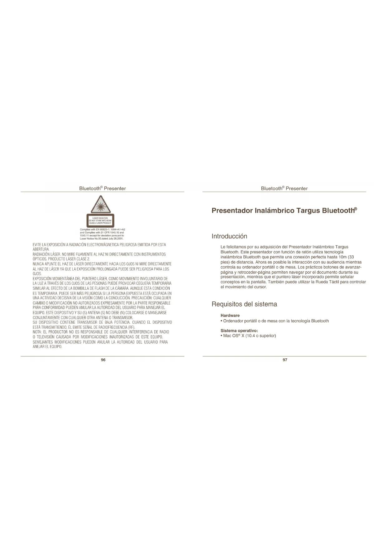 EVITE LA EXPOSICIÓN A RADIACIÓN ELECTROMÁGNETICA PELIGROSA EMITIDA POR ESTA ABERTURA.RADIACIÓN LÁSER. NO MIRE FIJAMENTE AL HAZ NI DIRECTAMENTE CON INSTRUMENTOS ÓPTICOS. PRODUCTO LÁSER CLASE 2.NUNCA APUNTE EL HAZ DE LÁSER DIRECTAMENTE HACIA LOS OJOS NI MIRE DIRECTAMENTE AL HAZ DE LÁSER YA QUE LA EXPOSICIÓN PROLONGADA PUEDE SER PELIGROSA PARA LOS OJOS.EXPOSICIÓN MOMENTÁNEA DEL PUNTERO LÁSER, COMO MOVIMIENTO INVOLUNTARIO DE LA LUZ A TRAVÉS DE LOS OJOS DE LAS PESONAS PUEDE PROVOCAR CEGUERA TEMPORARIA SIMILAR AL EFECTO DE LA BOMBILLA DE FLASH DE LA CÁMARA. AUNQUE ESTA CONDICIÓN ES TEMPORARIA, PUEDE SER MÁS PELIGROSA SI LA PERSONA EXPUESTA ESTÁ OCUPADA EN UNA ACTIVIDAD DECISIVA DE LA VISIÓN COMO LA CONDUCCIÓN. PRECAUCIÓN: CUALQUIER CAMBIO O MODIFICACIÓN NO AUTORIZADOS EXPRESAMENTE POR LA PARTE RESPONSABLE PARA CONFORMIDAD PUEDEN ANULAR LA AUTORIDAD DEL USUARIO PARA MANEJAR EL EQUIPO. ESTE DISPOSITIVO Y SU (S) ANTENA (S) NO DEBE (N) COLOCARSE O MANEJARSE CONJUNTAMENTE CON CUALQUIER OTRA ANTENA O TRANSMISOR.SU DISPOSITIVO CONTIENE TRANSMISOR DE BAJA POTENCIA. CUANDO EL DISPOSITIVO ESTÁ TRANSMITIENDO, ÉL EMITE SEÑAL DE RADIOFRECUENCIA (RF). NOTA: EL PRODUCTOR NO ES RESPONSABLE DE CUALQUIER INTERFERENCIA DE RADIO O TELEVISIÓN CAUSADA POR MODIFICACIONES INAUTORIZADAS DE ESTE EQUIPO. SEMEJANTES MODIFICACIONES PUEDEN ANULAR LA AUTORIDAD DEL USUARIO PARA ANEJAR EL EQUIPO. Introducción Le felicitamos por su adquisición del Presentador Inalámbrico Targus Bluetooth. Este presentador con función de ratón utiliza tecnología inalámbrica Bluetooth que permite una conexión perfecta hasta 10m (33 pies) de distancia. Ahora es posible la interacción con su audiencia mientras controla su ordenador portátil o de mesa. Los prácticos botones de avanzar- página y retroceder-página permiten navegar por el documento durante su presentación, mientras que el puntero láser incorporado permite señalar conceptos en la pantalla. También puede utilizar la Rueda Táctil para controlar el movimiento del cursor. Requisitos del sistema Hardware