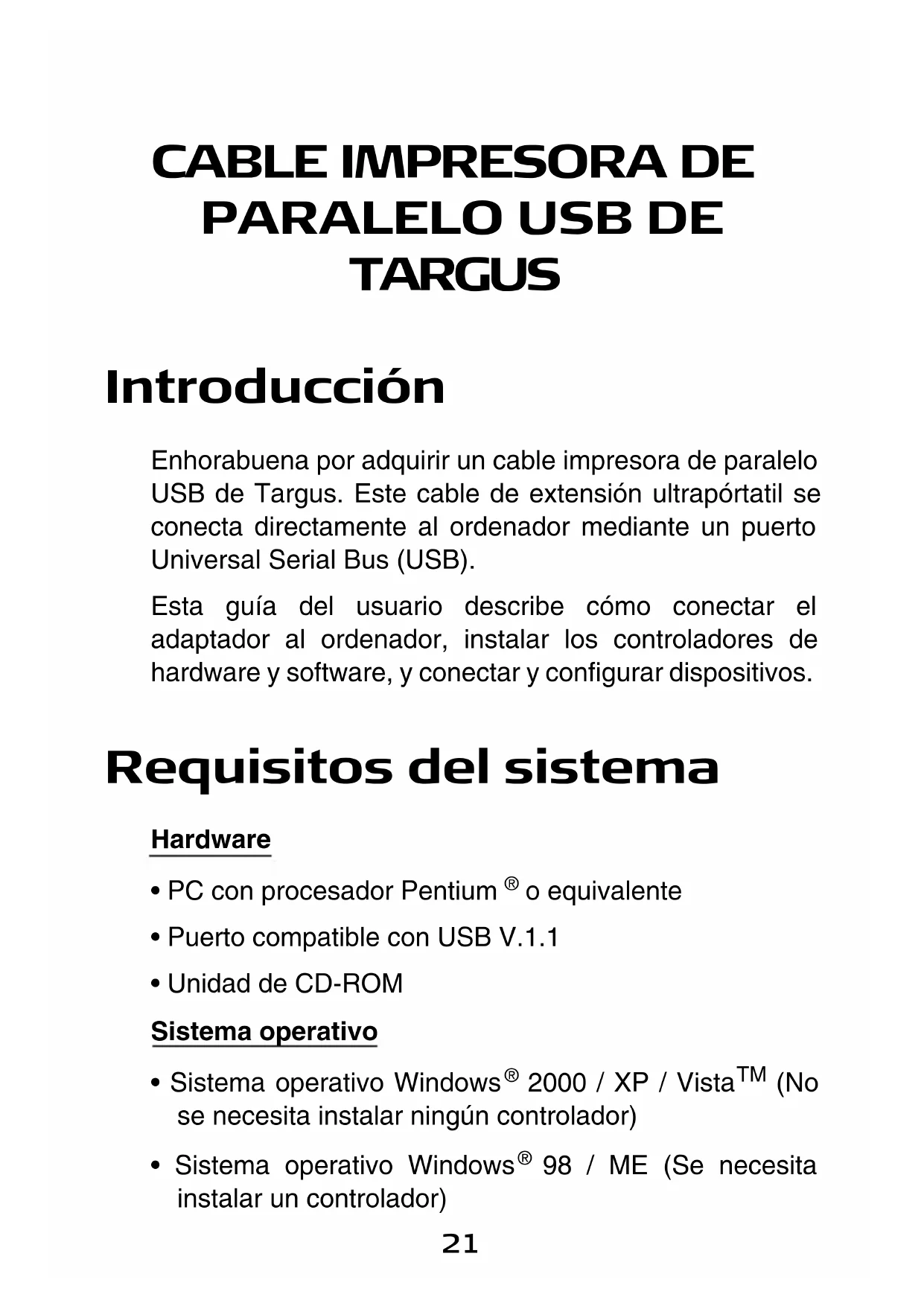TARGUS Introducción Enhorabuena por adquirir un cable impresora de paralelo USB de Targus. Este cable de extensión ultrapórtatil se conecta directamente al ordenador mediante un puerto Universal Serial Bus (USB). Esta guía del usuario describe cómo conectar el adaptador al ordenador, instalar los controladores de hardware y software, y conectar y configurar dispositivos. Requisitos del sistema Hardware