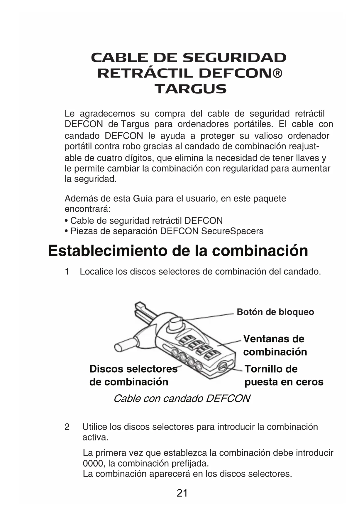 TARGUS Le agradecemos su compra del cable de seguridad retráctil DEFCON de Targus para ordenadores portátiles. El cable con candado DEFCON le ayuda a proteger su valioso ordenador portátil contra robo gracias al candado de combinación reajust-able de cuatro dígitos, que elimina la necesidad de tener llaves y le permite cambiar la combinación con regularidad para aumentar la seguridad.Además de esta Guía para el usuario, en este paqueteencontrará:• Cable de seguridad retráctil DEFCON• Piezas de separación DEFCON SecureSpacers1 Localice los discos selectores de combinación del candado.Botón de bloqueo2 Utilice los discos selectores para introducir la combinación activa.La primera vez que establezca la combinación debe introducir 0000, la combinación prefijada.La combinación aparecerá en los discos selectores.