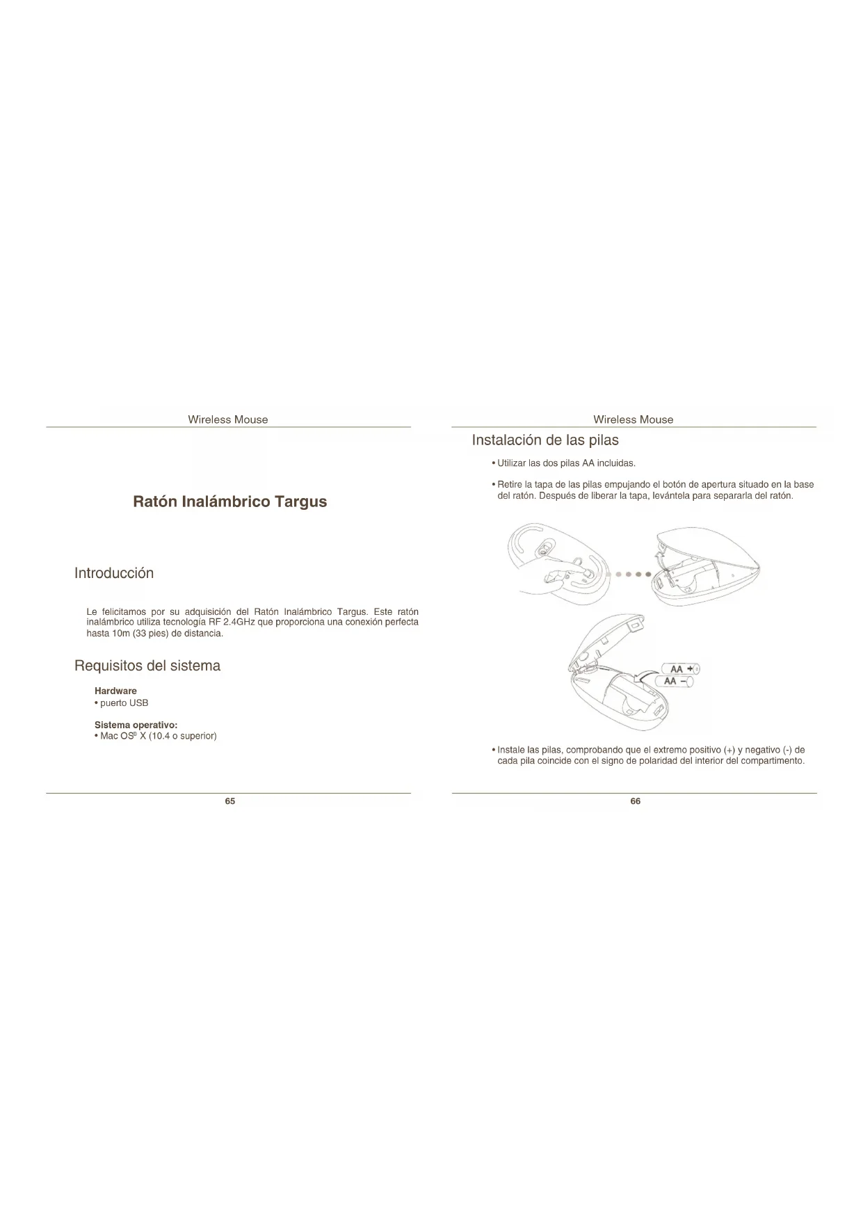 Ratón Inalámbrico Targus Le felicitamos por su adquisición del Ratón Inalámbrico Targus. Este ratón inalámbrico utiliza tecnología RF 2.4GHz que proporciona una conexión perfecta hasta 10m (33 pies) de distancia. Introducción Requisitos del sistema Hardware