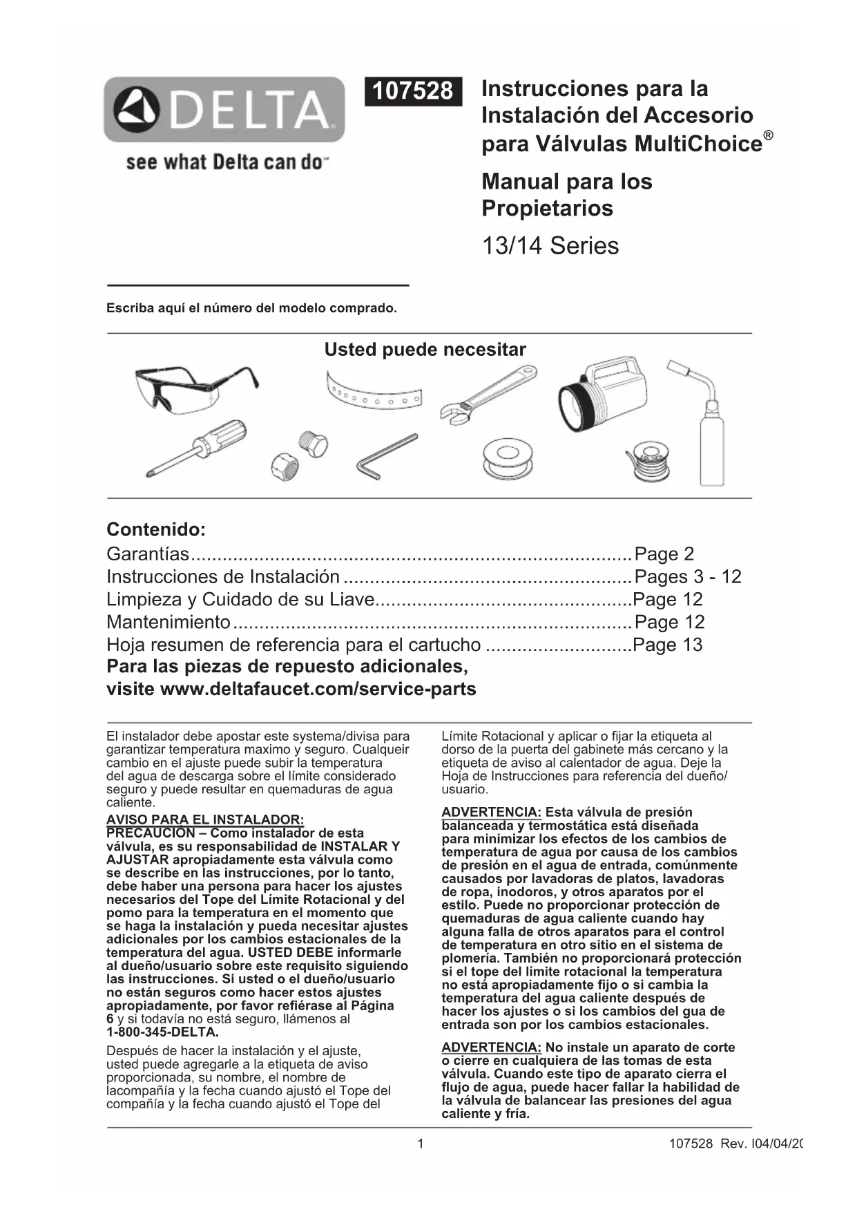 Manual para los Propietarios 13/14 Series Escriba aquí el número del modelo comprado. Usted puede necesitar Contenido: Garantías ....................................................................................Page 2 Instrucciones de Instalación .......................................................Pages 3 - 12 Limpieza y Cuidado de su Liave.................................................Page 12 Mantenimiento ............................................................................ Page 12 Hoja resumen de referencia para el cartucho ............................Page 13 Para las piezas de repuesto adicionales, visite www.deltafaucet.com/service-parts Límite Rotacional y aplicar o jar la etiqueta al dorso de la puerta del gabinete más cercano y la etiqueta de aviso al calentador de agua. Deje la Hoja de Instrucciones para referencia del dueño/ usuario. ADVERTENCIA: Esta válvula de presión balanceada y termostática está diseñada para minimizar los efectos de los cambios de temperatura de agua por causa de los cambios de presión en el agua de entrada, comúnmente causados por lavadoras de platos, lavadoras de ropa, inodoros, y otros aparatos por el estilo. Puede no proporcionar protección de quemaduras de agua caliente cuando hay alguna falla de otros aparatos para el control de temperatura en otro sitio en el sistema de plomería. También no proporcionará protección si el tope del límite rotacional la temperatura no está apropiadamente jo o si cambia la temperatura del agua caliente después de hacer los ajustes o si los cambios del gua de entrada son por los cambios estacionales. ADVERTENCIA: No instale un aparato de corte o cierre en cualquiera de las tomas de esta válvula. Cuando este tipo de aparato cierra el ujo de agua, puede hacer fallar la habilidad de la válvula de balancear las presiones del agua caliente y fría. El instalador debe apostar este systema/divisa para garantizar temperatura maximo y seguro. Cualqueir cambio en el ajuste puede subir la temperatura del agua de descarga sobre el límite considerado seguro y puede resultar en quemaduras de agua caliente. AVISO PARA EL INSTALADOR: PRECAUCIÓN – Como instalador de esta válvula, es su responsabilidad de INSTALAR Y AJUSTAR apropiadamente esta válvula como se describe en las instrucciones, por lo tanto, debe haber una persona para hacer los ajustes necesarios del Tope del Límite Rotacional y del pomo para la temperatura en el momento que se haga la instalación y pueda necesitar ajustes adicionales por los cambios estacionales de la temperatura del agua. USTED DEBE informarle al dueño/usuario sobre este requisito siguiendo las instrucciones. Si usted o el dueño/usuario no están seguros como hacer estos ajustes apropiadamente, por favor reérase al Página 6 y si todavía no está seguro, llámenos al 1-800-345-DELTA. Después de hacer la instalación y el ajuste, usted puede agregarle a la etiqueta de aviso proporcionada, su nombre, el nombre de lacompañía y la fecha cuando ajustó el Tope del compañía y la fecha cuando ajustó el Tope del