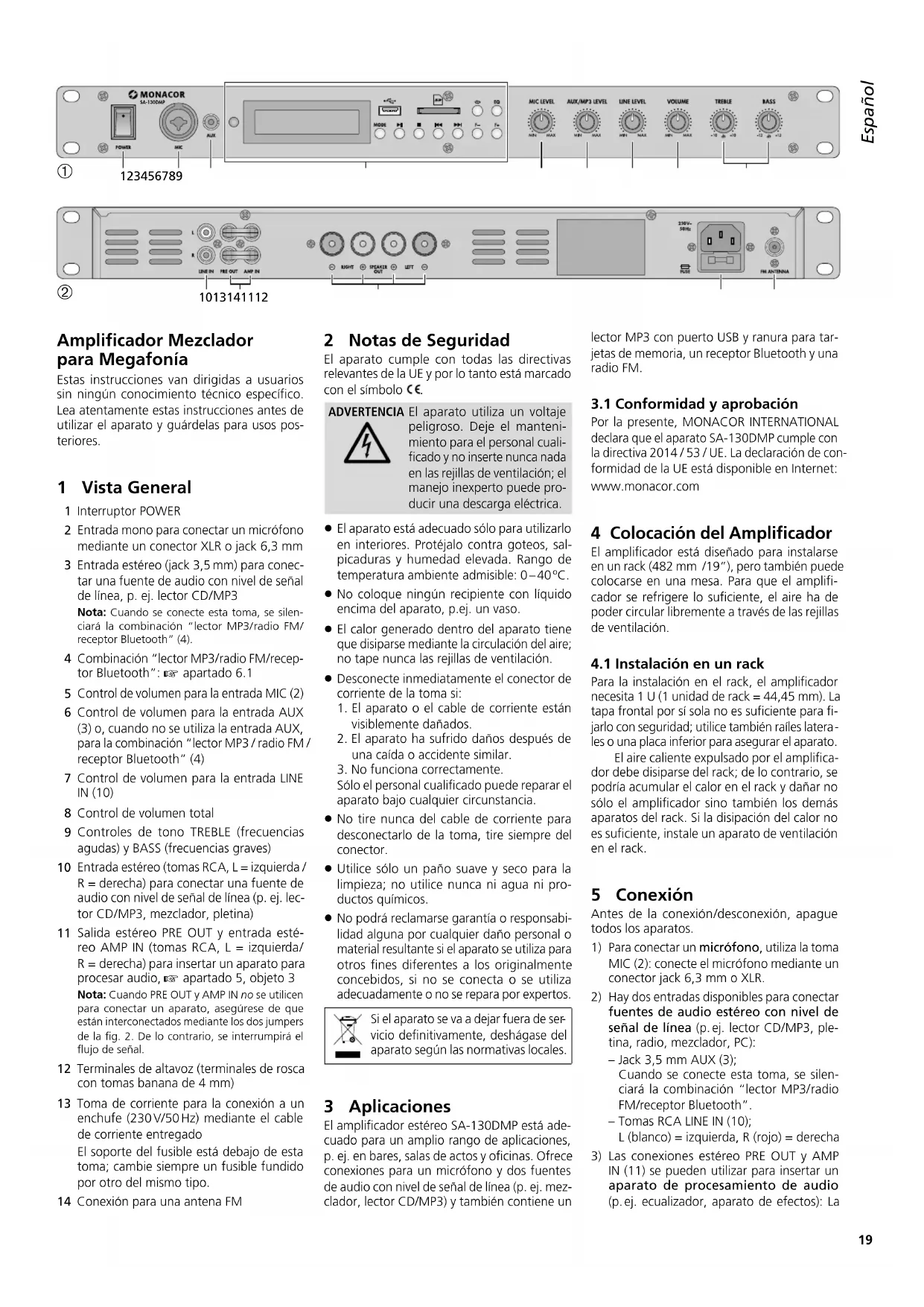 Para la instalación en el rack, el amplificador necesita 1 U (1 unidad de rack = 44,45 mm). La tapa frontal por sí sola no es suficiente para fi-jarlo con seguridad; utilice también raíles latera les o una placa inferior para asegurar el aparato.El aire caliente expulsado por el amplifica-dor debe disiparse del rack; de lo contrario, se podría acumular el calor en el rack y dañar no sólo el amplificador sino también los demás aparatos del rack. Si la disipación del calor no es suficiente, instale un aparato de ventilación en el rack. 5 Conexión Antes de la conexión /desconexión, apague todos los aparatos. Para conectar un micrófono, utiliza la toma MIC (2): conecte el micrófono mediante un conector jack 6,3 mm o XLR. Hay dos entradas disponibles para conectar fuentes de audio estéreo con nivel de señal de línea (p. ej. lector CD / MP3, ple- tina, radio, mezclador, PC): – Jack 3,5 mm AUX (3); Cuando se conecte esta toma, se silen-ciará la combinación “lector MP3 / radio FM /receptor Bluetooth”.– Tomas RCA LINE IN (10); L (blanco) = izquierda, R (rojo) = derecha Las conexiones estéreo PRE OUT y AMP IN (11) se pueden utilizar para insertar un aparato de procesamiento de audio (p. ej. ecualizador, aparato de efectos): La 2 Notas de Seguridad El aparato cumple con todas las directivas relevantes de la UE y por lo tanto está marcado con el símbolo .ADVERTENCIAEl aparato utiliza un voltaje peligroso. Deje el manteni-miento para el personal cuali-ficado y no inserte nunca nada en las rejillas de ventilación; el manejo inexperto puede pro-ducir una descarga eléctrica. El aparato está adecuado sólo para utilizarlo en interiores. Protéjalo contra goteos, sal-picaduras y humedad elevada. Rango de temperatura ambiente admisible: 0 – 40 ºC. No coloque ningún recipiente con líquido encima del aparato, p.ej. un vaso. El calor generado dentro del aparato tiene que disiparse mediante la circulación del aire; no tape nunca las rejillas de ventilación. Desconecte inmediatamente el conector de corriente de la toma si: El aparato o el cable de corriente están visiblemente dañados.2. El aparato ha sufrido daños después de una caída o accidente similar.3. No funciona correctamente.Sólo el personal cualificado puede reparar el aparato bajo cualquier circunstancia. No tire nunca del cable de corriente para desconectarlo de la toma, tire siempre del conector. Utilice sólo un paño suave y seco para la limpieza; no utilice nunca ni agua ni pro-ductos químicos. No podrá reclamarse garantía o responsabi-lidad alguna por cualquier daño personal o material resultante si el aparato se utiliza para otros fines diferentes a los originalmente concebidos, si no se conecta o se utiliza adecuadamente o no se repara por expertos.Si el aparato se va a dejar fuera de ser vicio definitivamente, deshágase del aparato según las normativas locales. 3 Aplicaciones El amplificador estéreo SA-130DMP está ade-cuado para un amplio rango de aplicaciones, p. ej. en bares, salas de actos y oficinas. Ofrece conexiones para un micrófono y dos fuentes de audio con nivel de señal de línea (p. ej. mez-clador, lector CD/MP3) y también contiene un Amplificador Mezclador paraMegafonía Estas instrucciones van dirigidas a usuarios sin ningún conocimiento técnico específico. Lea atentamente estas instrucciones antes de utilizar el aparato y guárdelas para usos pos-teriores. 1 Vista General 1 Interruptor POWER Entrada mono para conectar un micrófono mediante un conector XLR o jack 6,3 mm 3 Entrada estéreo (jack 3,5 mm) para conec- tar una fuente de audio con nivel de señal de línea, p. ej. lector CD / MP3Nota: Cuando se conecte esta toma, se silen- ciará la combinación “lector MP3 / radio FM / receptor Bluetooth” (4).