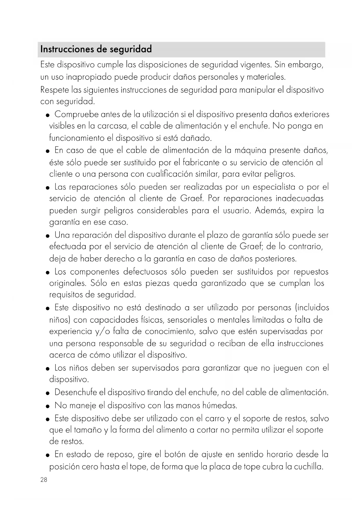 - 3 años de motor-garantía Instrucciones de seguridad Este dispositivo cumple las disposiciones de seguridad vigentes. Sin embargo, un uso inapropiado puede producir daños personales y materiales. Respete las siguientes instrucciones de seguridad para manipular el dispositivo con seguridad. ● Compruebe antes de la utilización si el dispositivo presenta daños exteriores visibles en la carcasa, el cable de alimentación y el enchufe. No ponga en funcionamiento el dispositivo si está dañado. ● En caso de que el cable de alimentación de la máquina presente daños, éste sólo puede ser sustituido por el fabricante o su servicio de atención al cliente o una persona con cualificación similar, para evitar peligros. ● Las reparaciones sólo pueden ser realizadas por un especialista o por el servicio de atención al cliente de Graef. Por reparaciones inadecuadas pueden surgir peligros considerables para el usuario. Además, expira la garantía en ese caso. ● Una reparación del dispositivo durante el plazo de garantía sólo puede ser efectuada por el servicio de atención al cliente de Graef; de lo contrario, deja de haber derecho a la garantía en caso de daños posteriores. ● Los componentes defectuosos sólo pueden ser sustituidos por repuestos originales. Sólo en estas piezas queda garantizado que se cumplan los requisitos de seguridad. ● Este dispositivo no está destinado a ser utilizado por personas (incluidos niños) con capacidades físicas, sensoriales o mentales limitadas o falta de experiencia y/o falta de conocimiento, salvo que estén supervisadas por una persona responsable de su seguridad o reciban de ella instrucciones acerca de cómo utilizar el dispositivo. ● Los niños deben ser supervisados para garantizar que no jueguen con el dispositivo. ● Desenchufe el dispositivo tirando del enchufe, no del cable de alimentación. ● No maneje el dispositivo con las manos húmedas. ● Este dispositivo debe ser utilizado con el carro y el soporte de restos, salvo que el tamaño y la forma del alimento a cortar no permita utilizar el soporte de restos. ● En estado de reposo, gire el botón de ajuste en sentido horario desde la posición cero hasta el tope, de forma que la placa de tope cubra la cuchilla.29 p. 3228