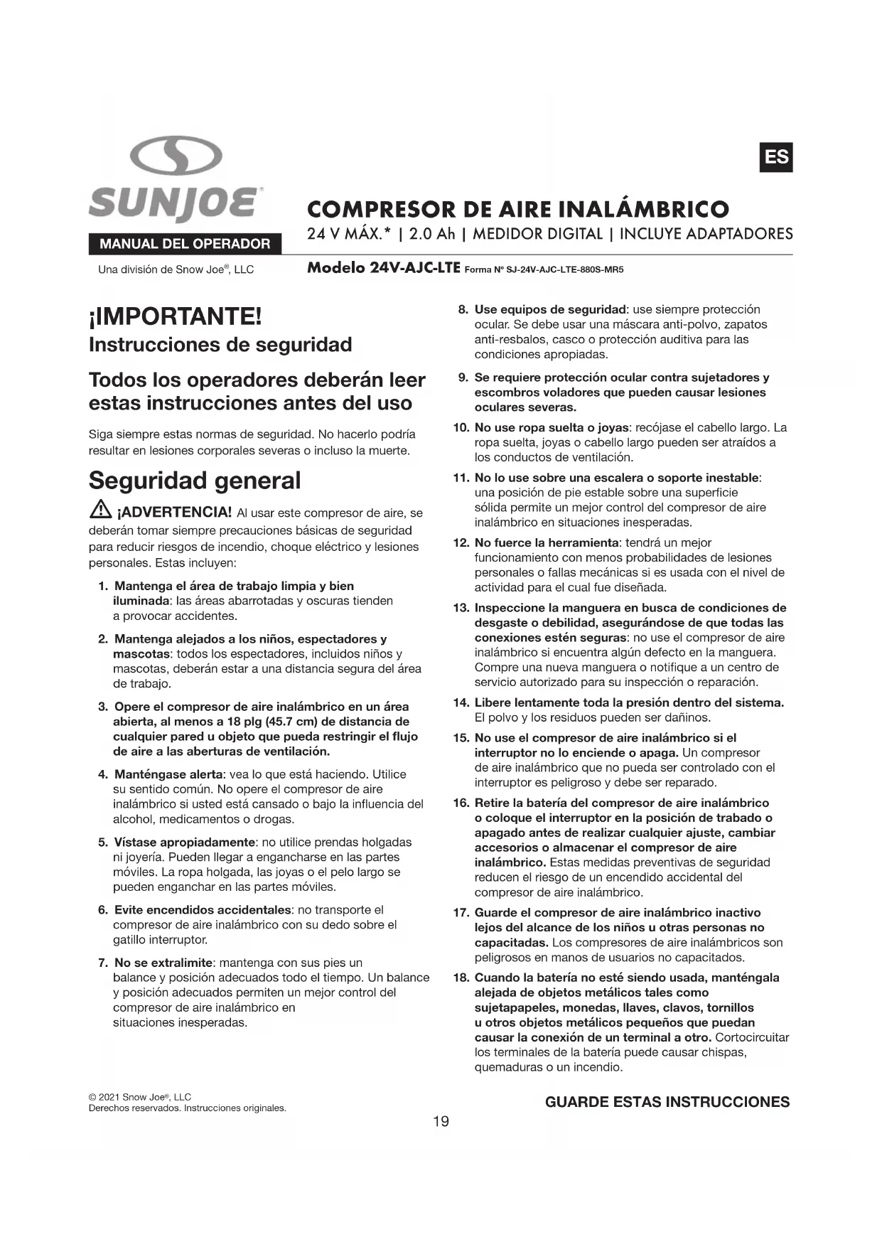 Descarga las instrucciones para tu Compresor en formato PDF gratis! Encuentra tus instrucciones 24VAJCLTE - Sun Joe y toma tu dispositivo electrónico nuevamente en la mano. En esta página están publicados todos los documentos necesarios para el uso de su dispositivo. 24VAJCLTE de la marca Sun Joe.