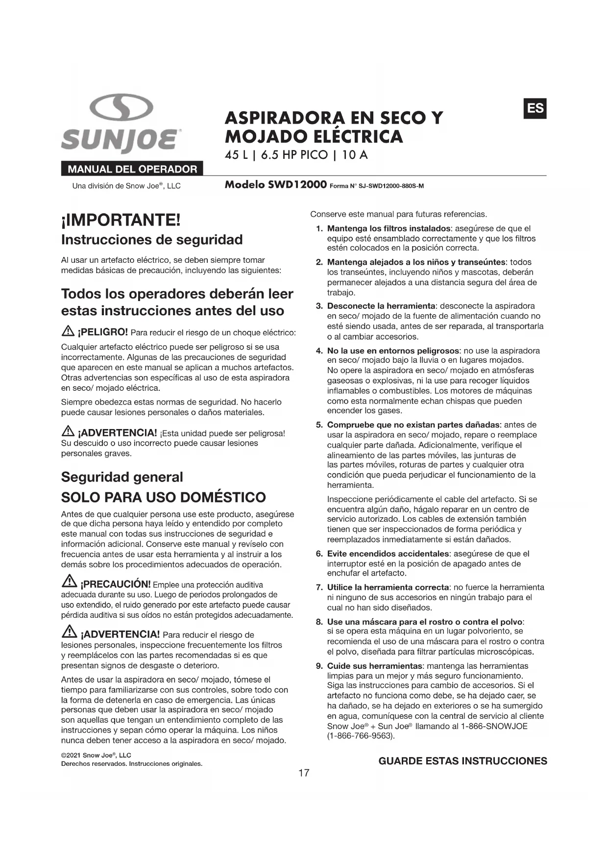 SWD12000 - Aspiradora Sun Joe - Manual de uso y guía de instrucciones gratis