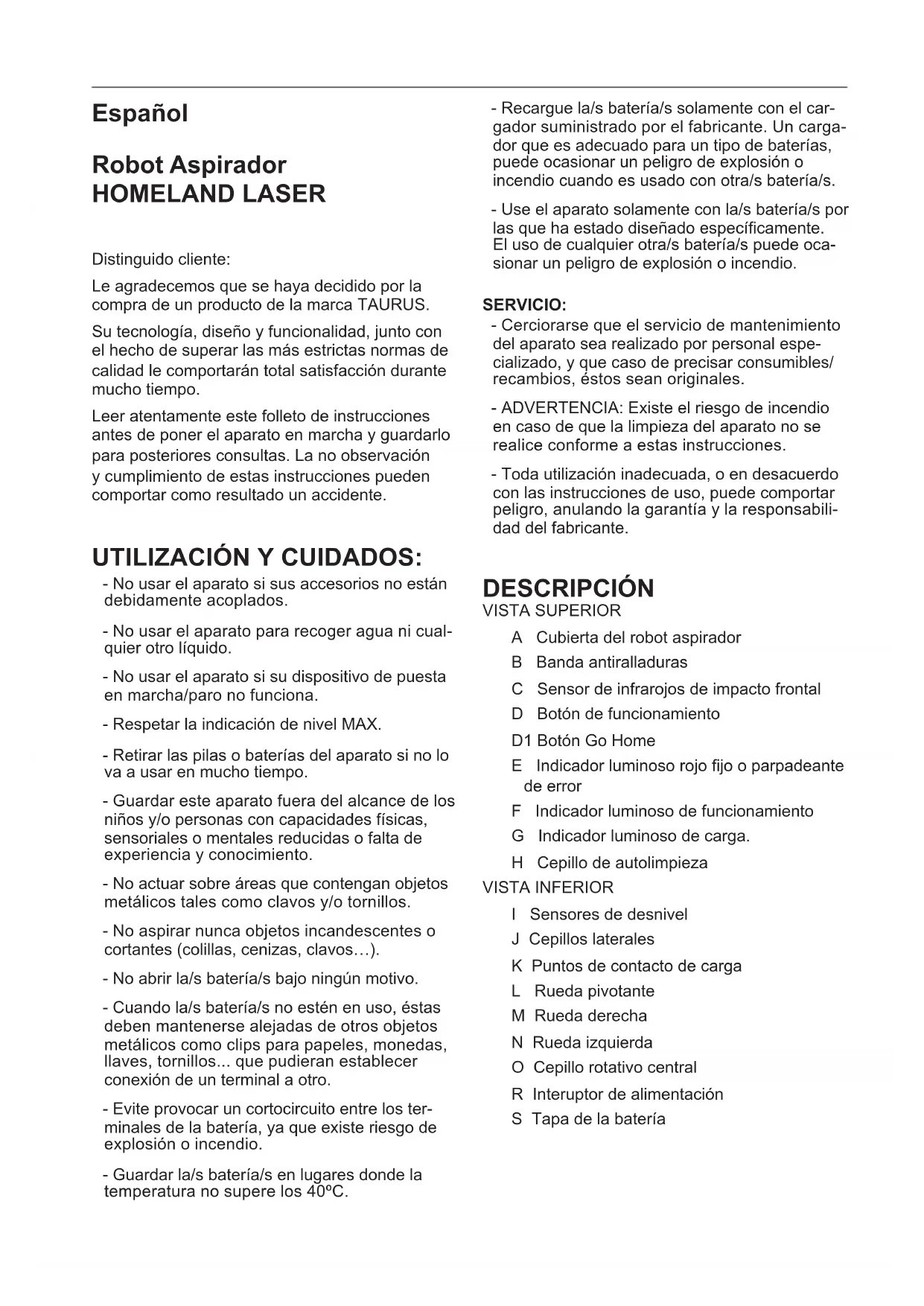 Standby/Stop The yellow light ickers Working The yellow light is always on Return charger The green light ickers Recharging The green light ickers slowly Low power The green light ickers Full charger The green light is always on Abnormal bottom sensor The red and yellow light ickers and with ding-dong voice Re-put the host bakc to the oor. Abnormal bumper switch The red and yellow light ickers and with ding-dong voice Check the sensitivity of the front bumper. Side brush overloaded The red light ickers and with ding-dong voice Check the side brush. Left drive wheel overloaded The red and green light ickers and with ding-dong voice Check the left drive wheel. Right drive wheel overloaded The red and green light ickers and with ding-dong voice Check the right drive wheel. Abnormal fan The yellow light ickers fast and with ding-dong voice Check the fan. Abnormal laser The red light ickers fast and with ding-dong voice Check the laser. Abnormal appliance The red light always on and with ding-dong voice Abnormal roller brush The red light ickers and with ding-dong voice Check the roller brush.Español Robot Aspirador HOMELAND LASER Distinguido cliente: Le agradecemos que se haya decidido por la compra de un producto de la marca TAURUS. Su tecnología, diseño y funcionalidad, junto con el hecho de superar las más estrictas normas de calidad le comportarán total satisfacción durante mucho tiempo. Leer atentamente este folleto de instrucciones antes de poner el aparato en marcha y guardarlo para posteriores consultas. La no observación y cumplimiento de estas instrucciones pueden comportar como resultado un accidente. UTILIZACIÓN Y CUIDADOS: - No usar el aparato si sus accesorios no están debidamente acoplados. - No usar el aparato para recoger agua ni cual- quier otro líquido. - No usar el aparato si su dispositivo de puesta en marcha/paro no funciona. - Respetar la indicación de nivel MAX. - Retirar las pilas o baterías del aparato si no lo va a usar en mucho tiempo. - Guardar este aparato fuera del alcance de los niños y/o personas con capacidades físicas, sensoriales o mentales reducidas o falta de experiencia y conocimiento. - No actuar sobre áreas que contengan objetos metálicos tales como clavos y/o tornillos. - No aspirar nunca objetos incandescentes o cortantes (colillas, cenizas, clavos…). - No abrir la/s batería/s bajo ningún motivo. - Cuando la/s batería/s no estén en uso, éstas deben mantenerse alejadas de otros objetos metálicos como clips para papeles, monedas, llaves, tornillos... que pudieran establecer conexión de un terminal a otro. - Evite provocar un cortocircuito entre los ter- minales de la batería, ya que existe riesgo de explosión o incendio. - Guardar la/s batería/s en lugares donde la temperatura no supere los 40ºC. - Recargue la/s batería/s solamente con el car- gador suministrado por el fabricante. Un carga- dor que es adecuado para un tipo de baterías, puede ocasionar un peligro de explosión o incendio cuando es usado con otra/s batería/s. - Use el aparato solamente con la/s batería/s por las que ha estado diseñado especícamente. El uso de cualquier otra/s batería/s puede oca- sionar un peligro de explosión o incendio. SERVICIO: - Cerciorarse que el servicio de mantenimiento del aparato sea realizado por personal espe- cializado, y que caso de precisar consumibles/ recambios, éstos sean originales. - ADVERTENCIA: Existe el riesgo de incendio en caso de que la limpieza del aparato no se realice conforme a estas instrucciones. - Toda utilización inadecuada, o en desacuerdo con las instrucciones de uso, puede comportar peligro, anulando la garantía y la responsabili- dad del fabricante. DESCRIPCIÓN VISTA SUPERIOR A Cubierta del robot aspirador B Banda antiralladuras C Sensor de infrarojos de impacto frontal D Botón de funcionamiento D1 Botón Go Home E Indicador luminoso rojo jo o parpadeante de error F Indicador luminoso de funcionamiento G Indicador luminoso de carga. H Cepillo de autolimpieza VISTA INFERIOR I Sensores de desnivel J Cepillos laterales K Puntos de contacto de carga L Rueda pivotante M Rueda derecha N Rueda izquierda O Cepillo rotativo central R Interuptor de alimentación S Tapa de la bateríaBASE DE CARGA U Base de carga V Sensor de la base W Cargador X Puntos de contacto de carga