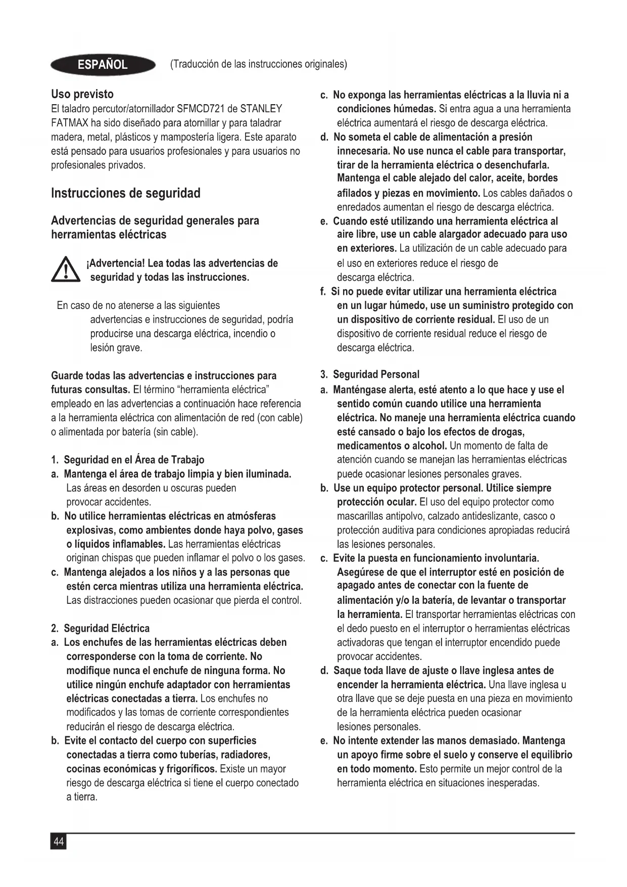 Utilice protectores para los oídos con los taladros de percusión. La exposición al ruido puede provocar pérdida auditiva. Instrucciones de seguridad adicionales para baterías y cargadores Baterías u Jamás trate de abrir las baterías por ningún motivo.u No exponga las baterías al agua.u No guarde la batería en lugares en los que la temperatura pueda superar los 40 °C. u Recargue la batería únicamente a una temperatura ambiente entre 10 °C y 40 °C. u Utilice únicamente el cargador suministrado con la herramienta para realizar la carga. uCuando vaya a desechar la batería, siga las instrucciones facilitadas en la sección “Protección del medio ambiente”. Cargadores u Utilice solo el cargador de STANLEY FATMAX para cargar la batería de la herramienta con la que fue suministrado. En caso de intentar cargar otras baterías, estas podrían explotar, lo que podría provocar lesiones y daños personales. u Nunca intente cargar baterías no recargables.u Haga sustituir los cables defectuosos inmediatamente.u No exponga el cargador al agua.u No abra el cargador.u No aplique ningún dispositivo para medir la resistencia del cargador.