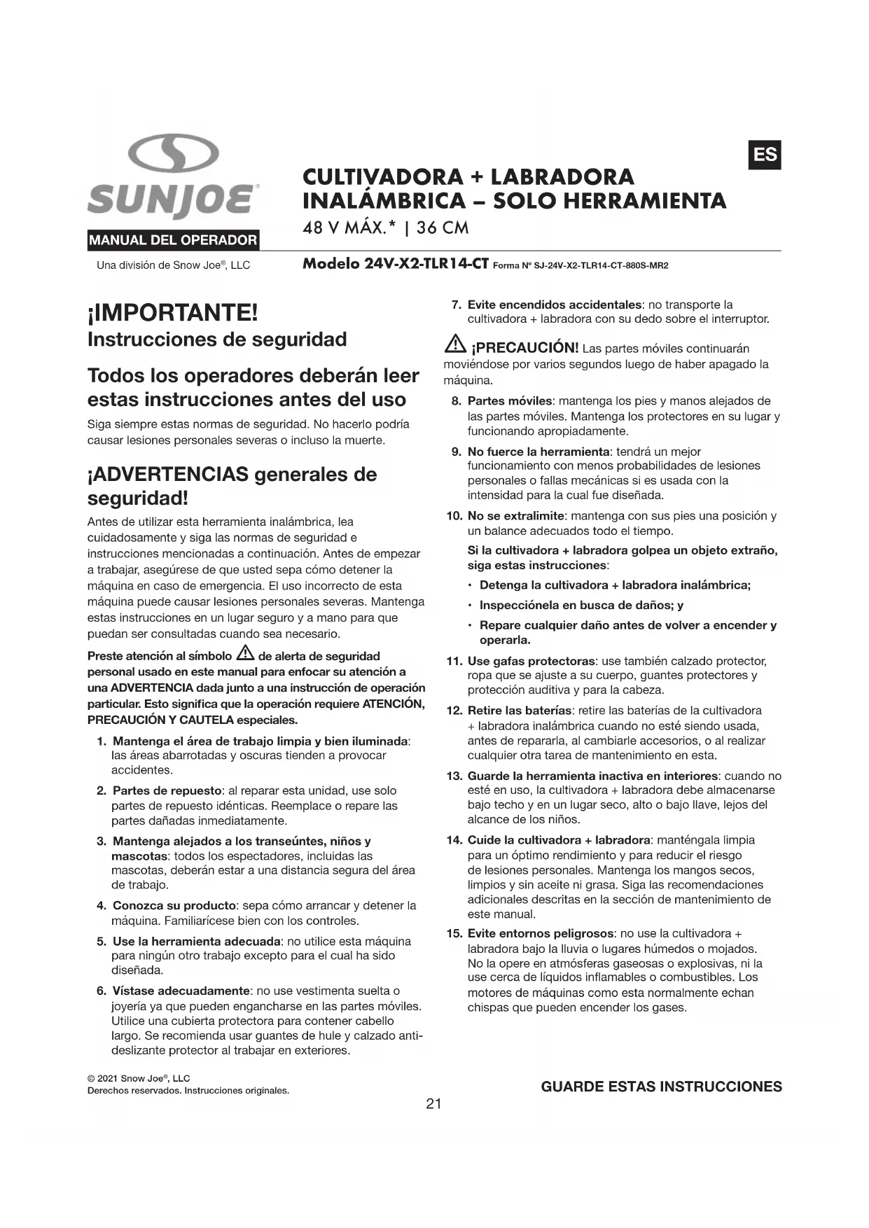 Descarga las instrucciones para tu Cultivador en formato PDF gratis! Encuentra tus instrucciones 24VX2TLR14CT - Sun Joe y toma tu dispositivo electrónico nuevamente en la mano. En esta página están publicados todos los documentos necesarios para el uso de su dispositivo. 24VX2TLR14CT de la marca Sun Joe.