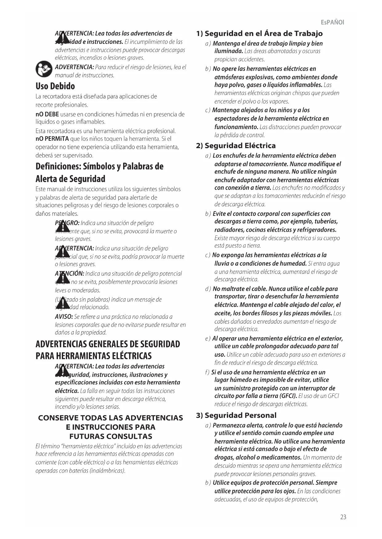 ADVERTENCIA: Lea todas las advertencias de seguridad e instrucciones. El incumplimiento de las advertencias e instrucciones puede provocar descargas eléctricas, incendios o lesionesgraves. ADVERTENCIA: Para reducir el riesgo de lesiones, lea el manual deinstrucciones.EsPAñOl