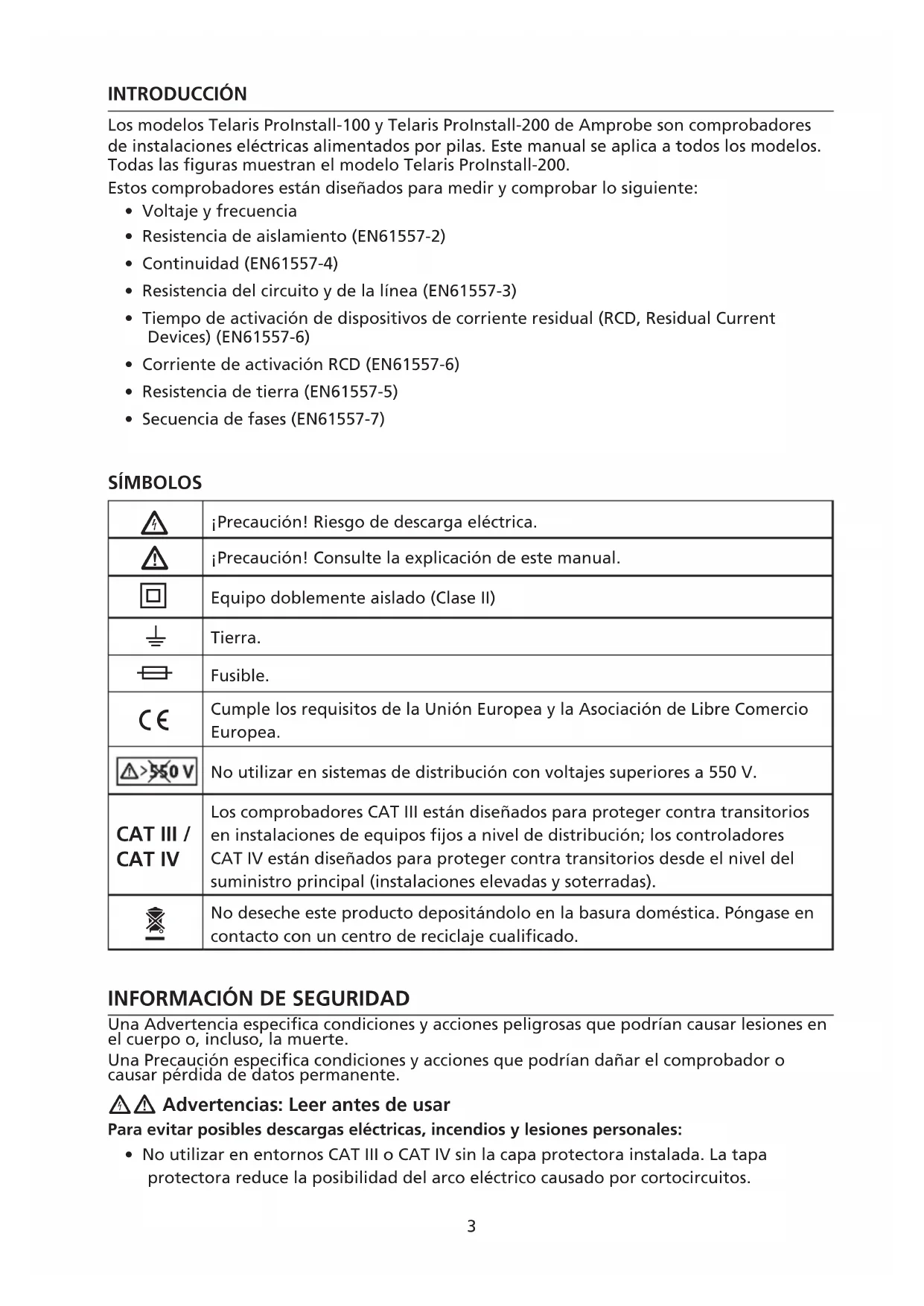 INTRODUCCIÓNLos modelos Telaris ProInstall-100 y Telaris ProInstall-200 de Amprobe son comprobadores de instalaciones eléctricas alimentados por pilas. Este manual se aplica a todos los modelos. Todas las figuras muestran el modelo Telaris ProInstall-200.Estos comprobadores están diseñados para medir y comprobar lo siguiente:• Voltaje y frecuencia• Resistencia de aislamiento (EN61557-2)• Continuidad (EN61557-4)• Resistencia del circuito y de la línea (EN61557-3)• Tiempo de activación de dispositivos de corriente residual (RCD, Residual Current Devices) (EN61557-6)• Corriente de activación RCD (EN61557-6)• Resistencia de tierra (EN61557-5)• Secuencia de fases (EN61557-7)SÍMBOLOS ¡Precaución! Riesgo de descarga eléctrica. ¡Precaución! Consulte la explicación de este manual. Equipo doblemente aislado (Clase II) Tierra. Fusible. Cumple los requisitos de la Unión Europea y la Asociación de Libre Comercio Europea.No utilizar en sistemas de distribución con voltajes superiores a 550 V.CAT III / CAT IVLos comprobadores CAT III están diseñados para proteger contra transitorios en instalaciones de equipos fijos a nivel de distribución; los controladores CAT IV están diseñados para proteger contra transitorios desde el nivel del suministro principal (instalaciones elevadas y soterradas). No deseche este producto depositándolo en la basura doméstica. Póngase en contacto con un centro de reciclaje cualificado.