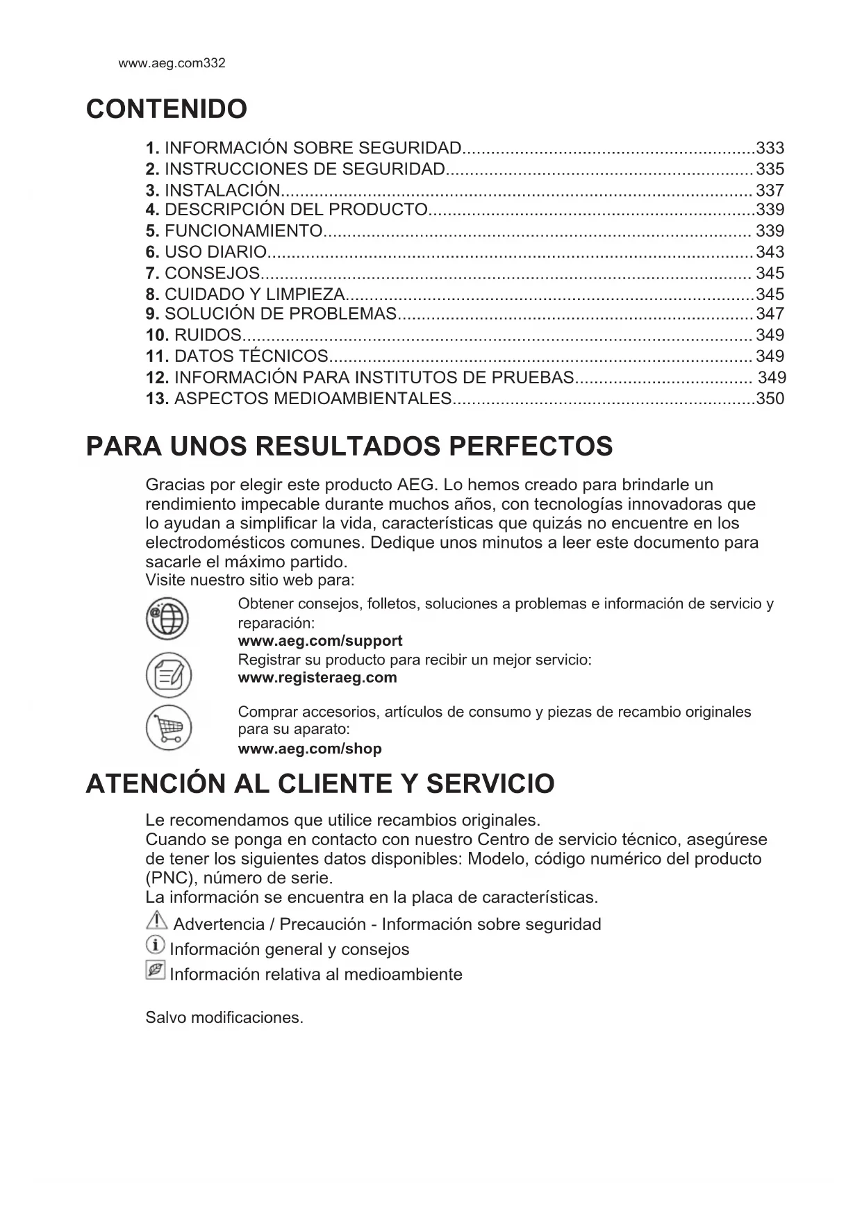 - Si el cable de alimentación sufre algún daño, el fabricante, su servicio técnico autorizado o un profesional tendrán que cambiarlo para evitar riesgos. www.aeg.com3342. INSTRUCCIONES DE SEGURIDAD