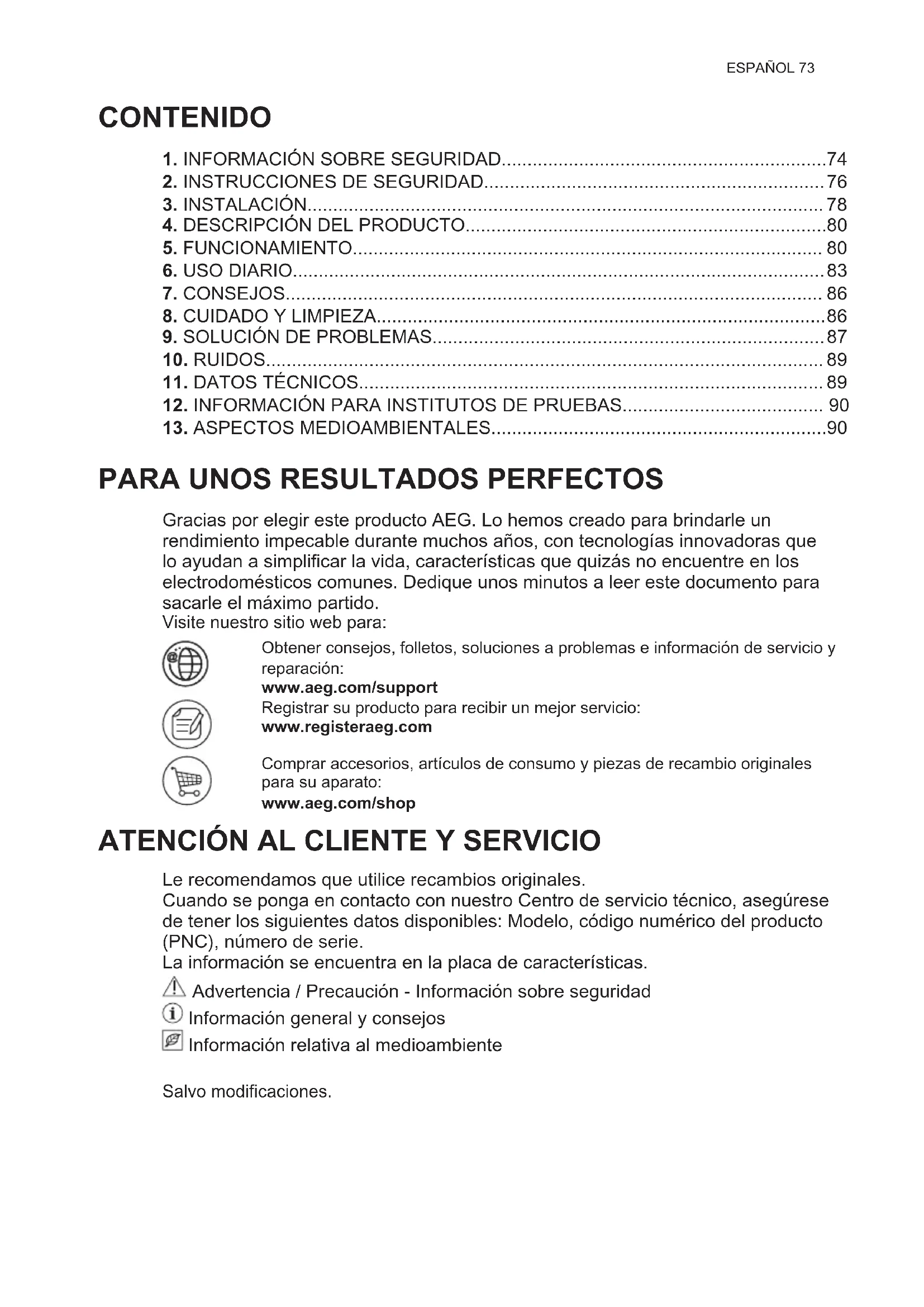 Le recomendamos que utilice recambios originales. Cuando se ponga en contacto con nuestro Centro de servicio técnico, asegúrese de tener los siguientes datos disponibles: Modelo, código numérico del producto (PNC), número de serie. La información se encuentra en la placa de características. Advertencia / Precaución - Información sobre seguridad Información general y consejos Información relativa al medioambiente Salvo modificaciones.